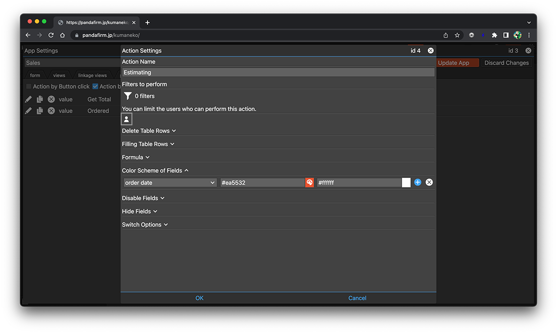 You can change the color of the field when you open the record add screen or edit screen or edit the field. Creation is done from the "actions" tab of the app settings screen.