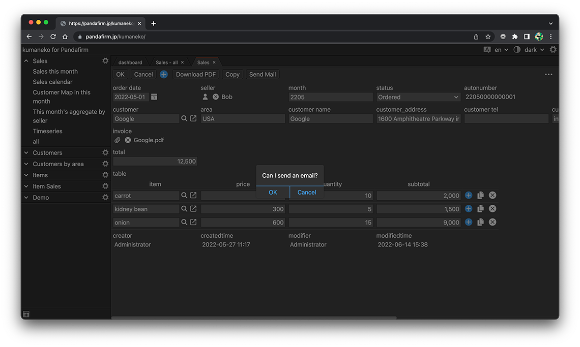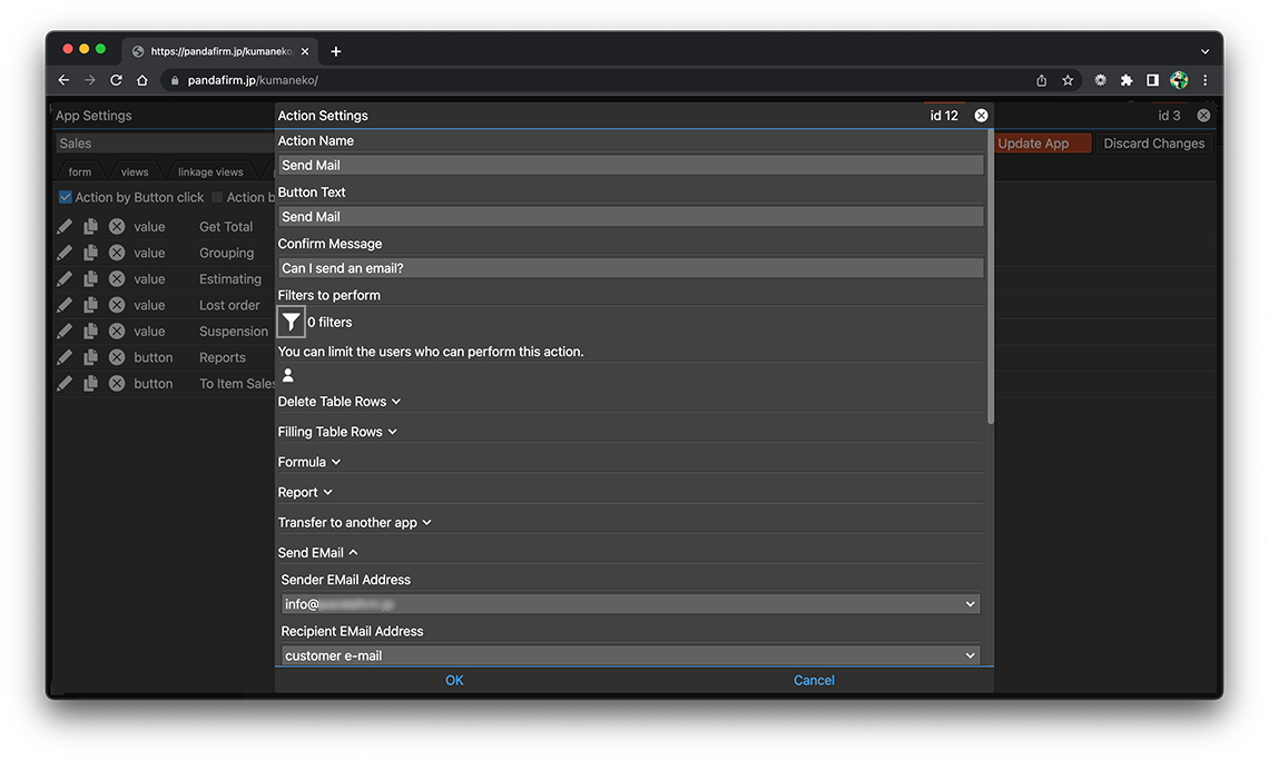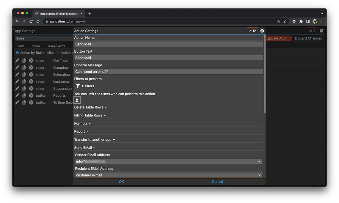 Enter the Action name and the Button Text and the Confirm Message, and in the "Send EMail" section, make the settings that suit your purpose.
