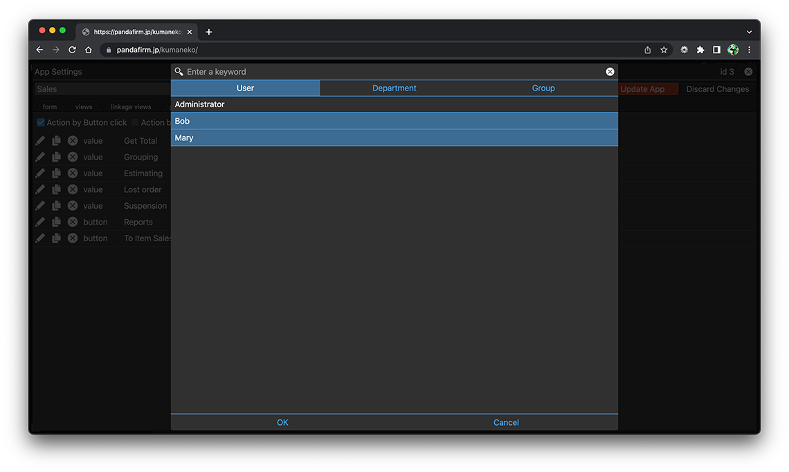 If you configure the execute users, you can execute the action only when the logged-in user matches those users. Click the user button to set the user who has the permission to perform the action.