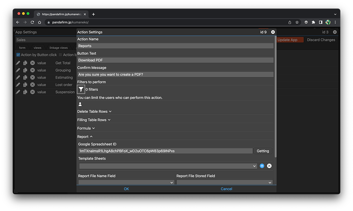 Enter the Action name and the Button Text and the Confirm Message, and enter the Spreadsheet ID in the Spreadsheet ID input field in the "Report" section, and press the "Getting" button.