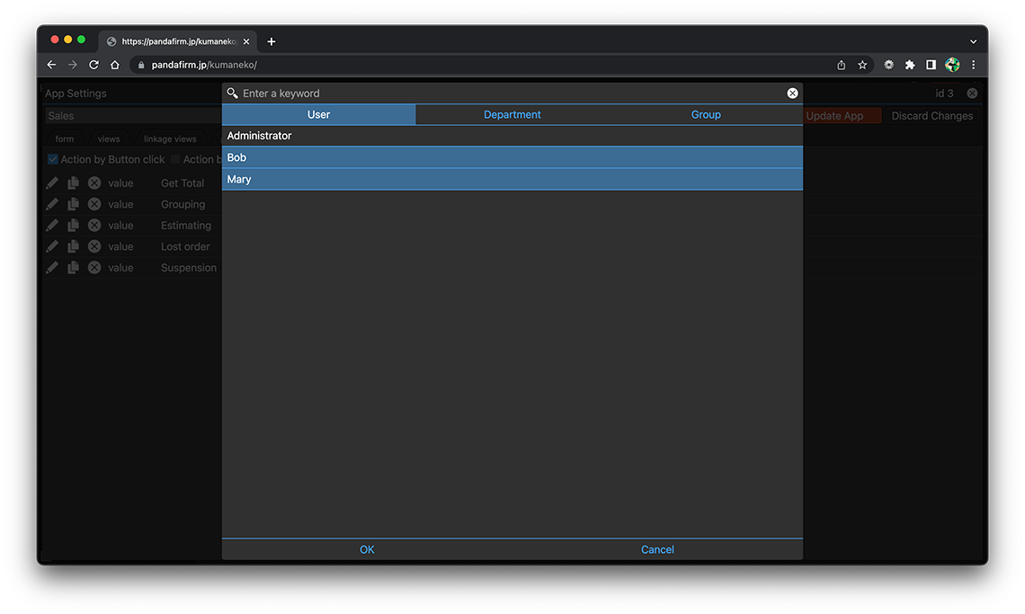 If you configure the execute users, you can execute the action only when the logged-in user matches those users. Click the user button to set the user who has the permission to perform the action.