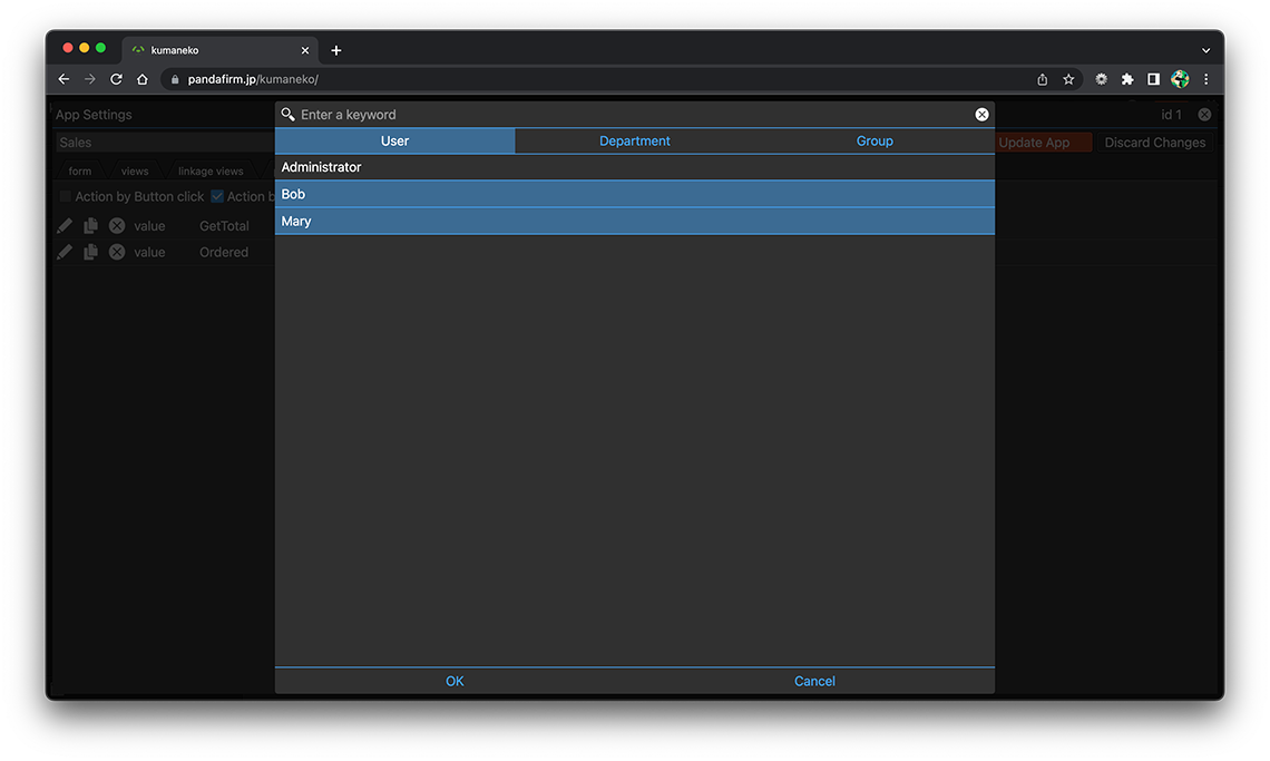 If you configure the execute users, you can execute the action only when the logged-in user matches those users. Click the user button to set the user who has the permission to perform the action.