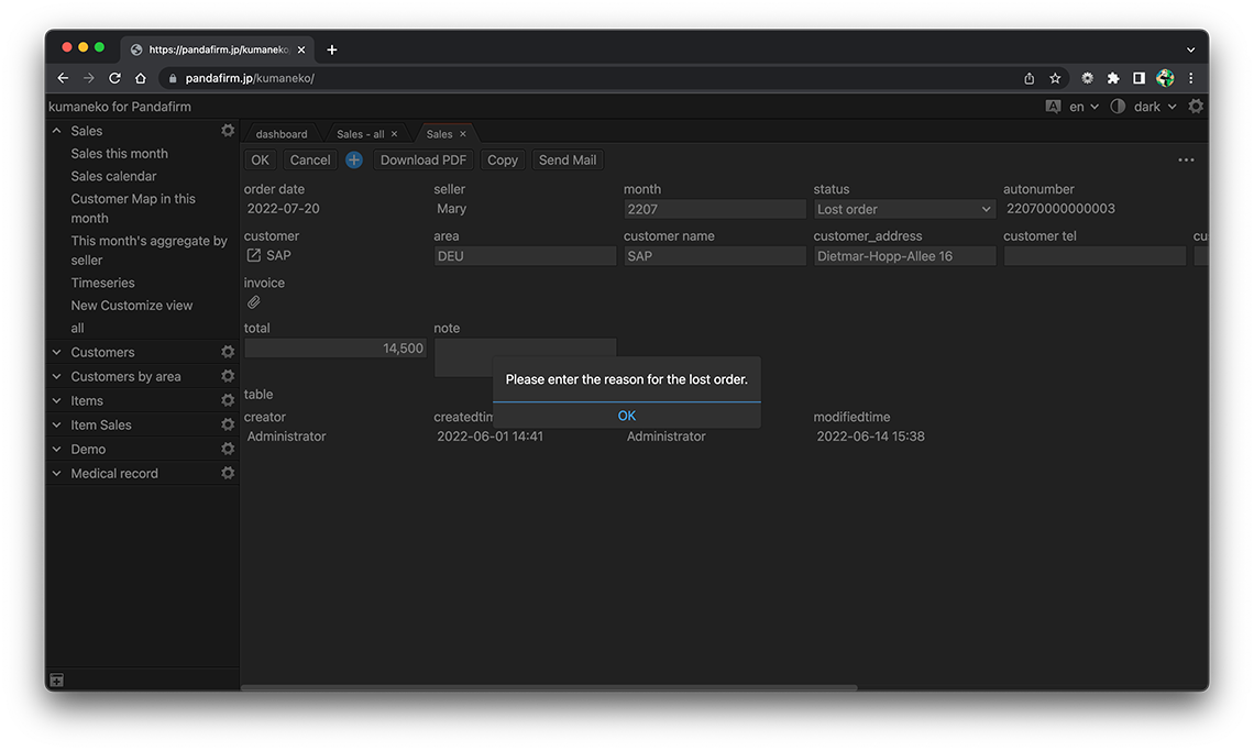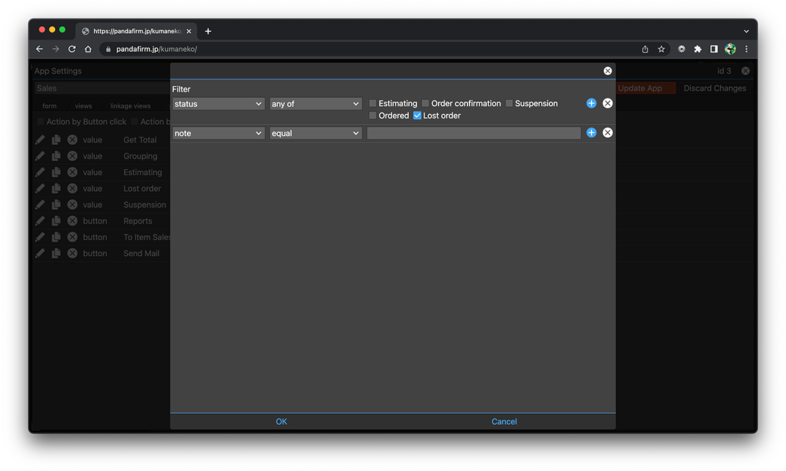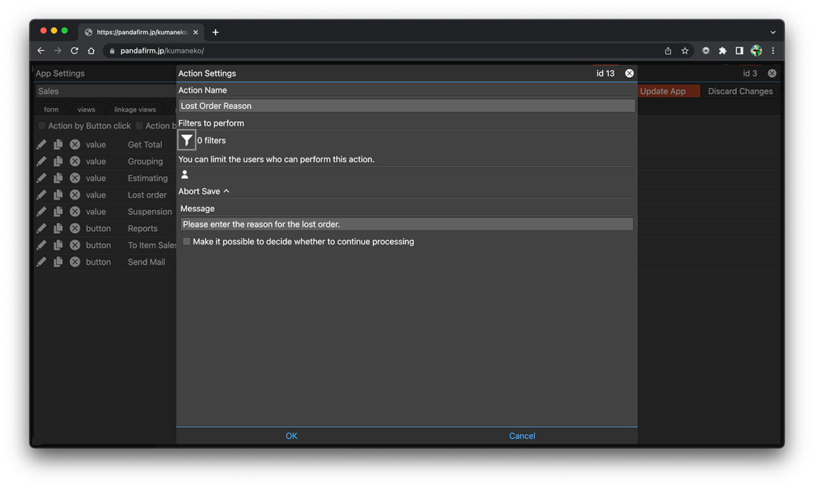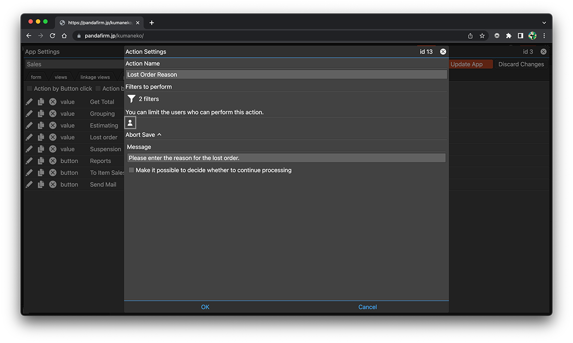 At the timing of saving the record, depending on the status of the record, you can stop processing or display a confirmation dialog to determine whether to continue processing. Creation is done from the "actions" tab of the app settings screen.