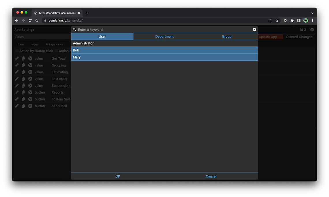If you configure the execute users, you can execute the action only when the logged-in user matches those users. Click the user button to set the user who has the permission to perform the action.
