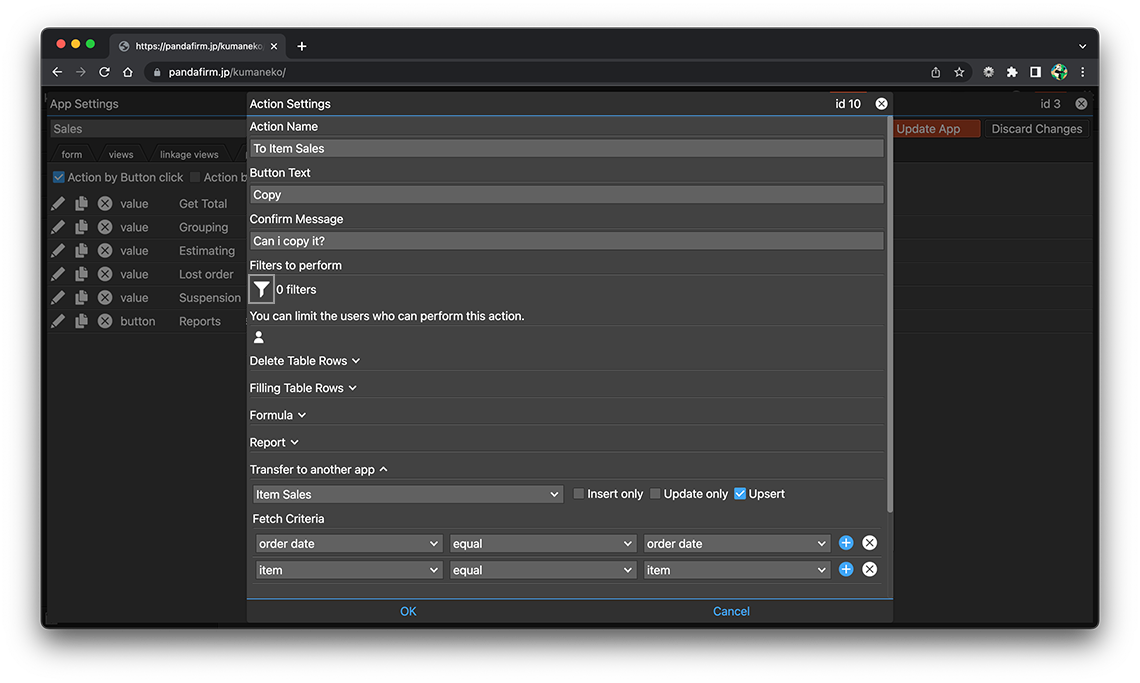 In addition to copying and updating records between apps, you can also decompose table rows and copy or update to other apps, or combine records from other apps into one table. Creation is done from the "actions" tab of the app settings screen.
