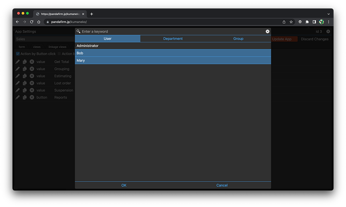 If you configure the execute users, you can execute the action only when the logged-in user matches those users. Click the user button to set the user who has the permission to perform the action.