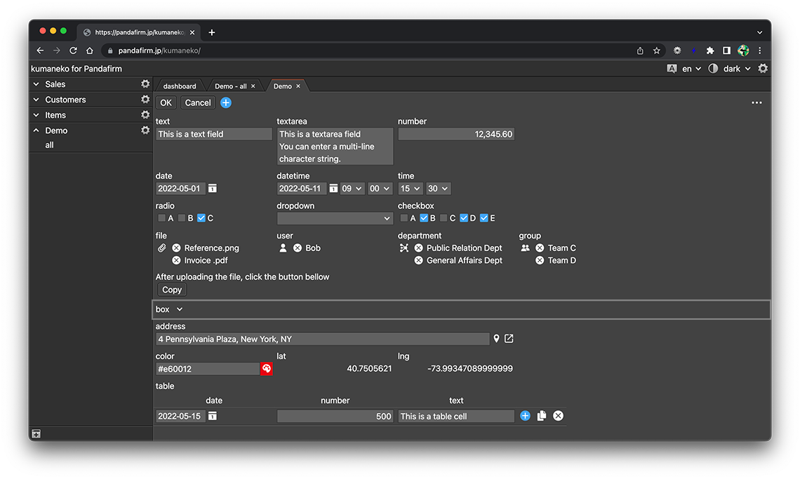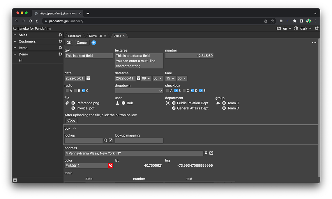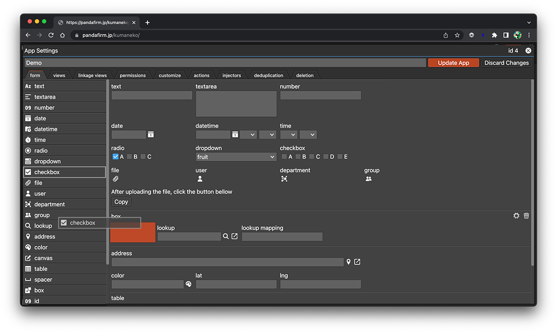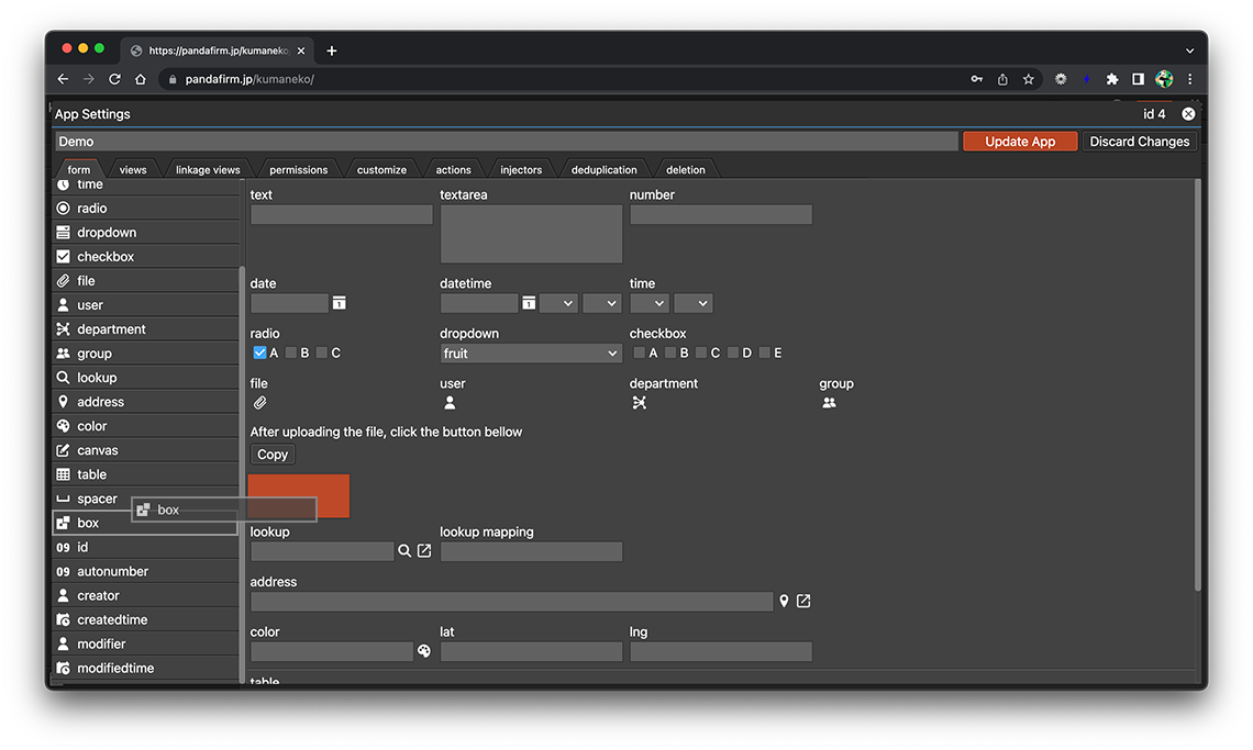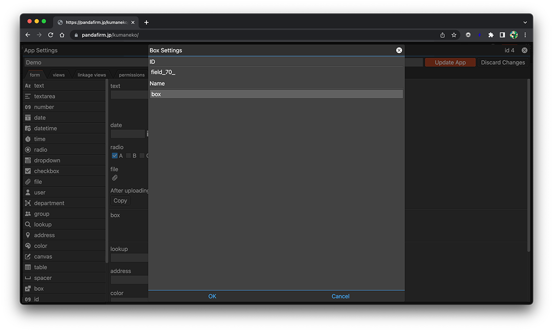 A box field is a field that groups multiple fields together and hides or shows them. Click the gear button in the field placed on the form to display the setting screen, and configure the setting according to your purpose on that screen.