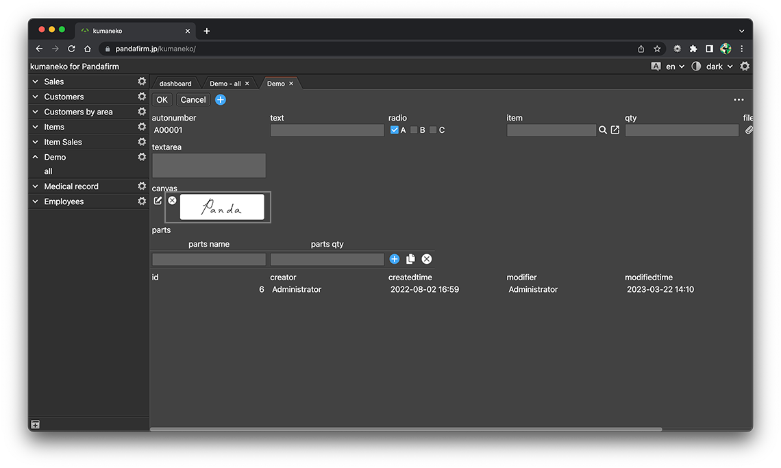 A canvas field is a field for handwritten notes and signatures. Click the gear button in the field placed on the form to display the setting screen, and configure the setting according to your purpose on that screen.