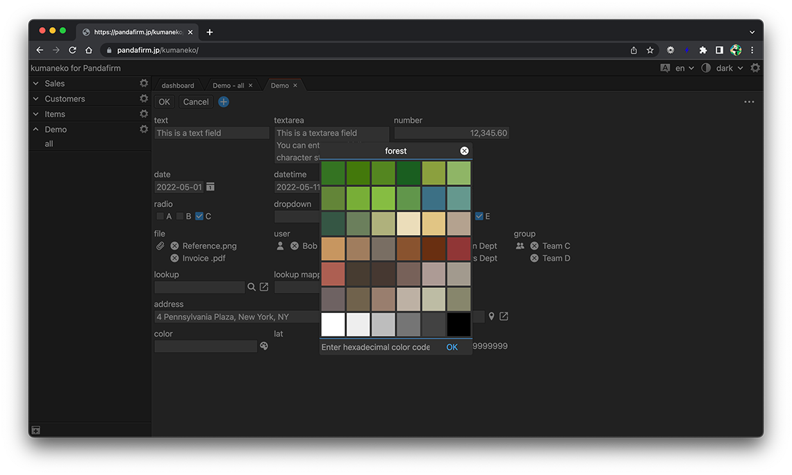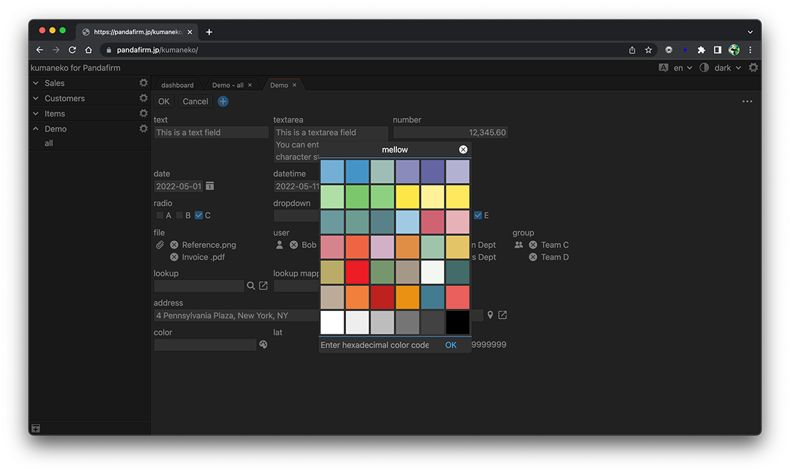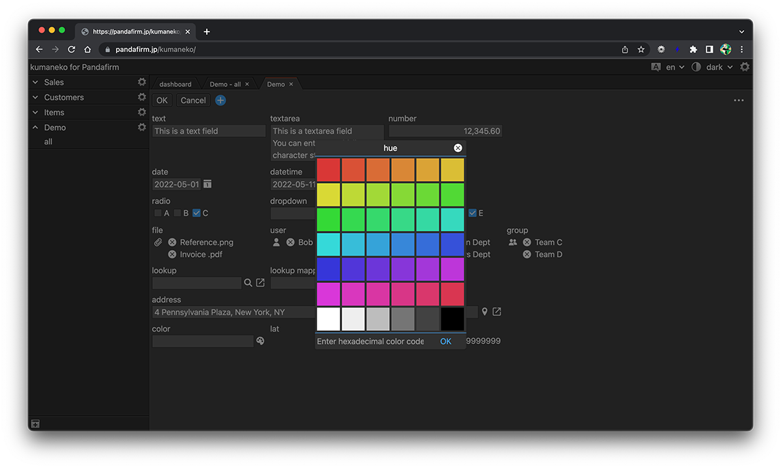 A color field is a field for selecting a color. Click the gear button in the field placed on the form to display the setting screen, and configure the setting according to your purpose on that screen.
