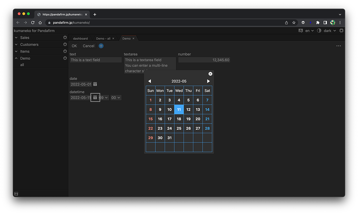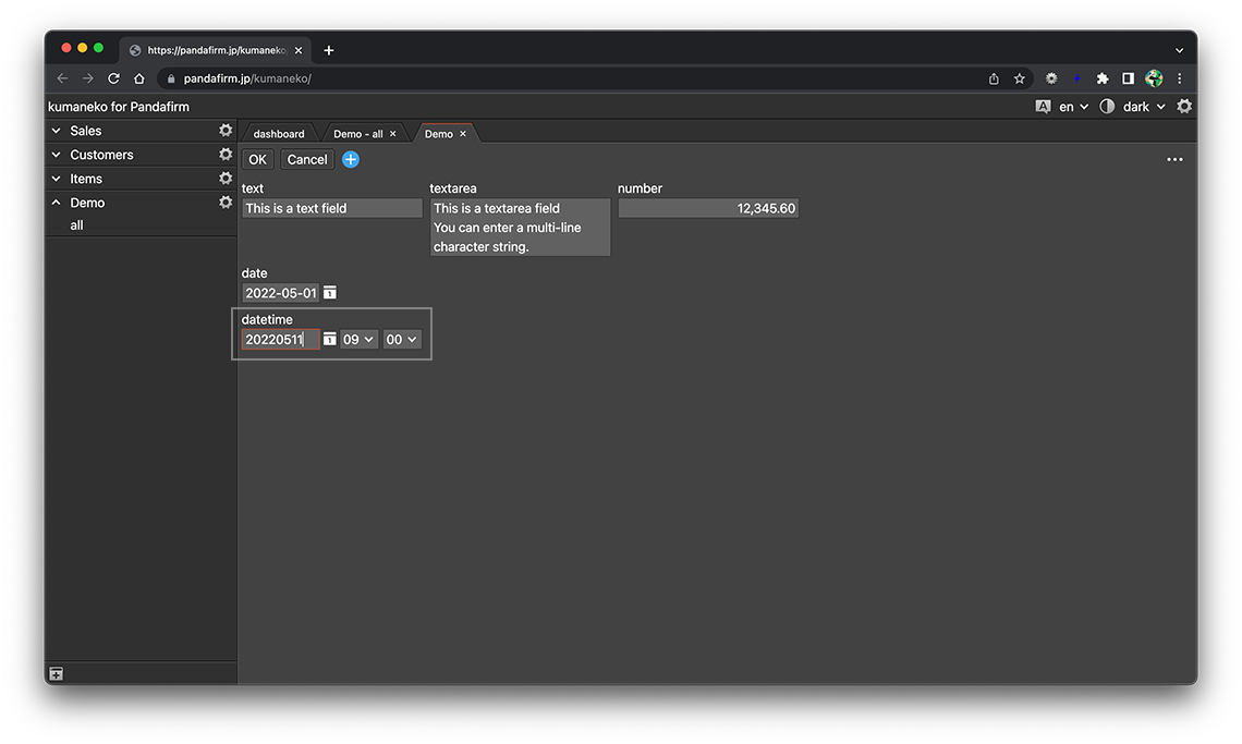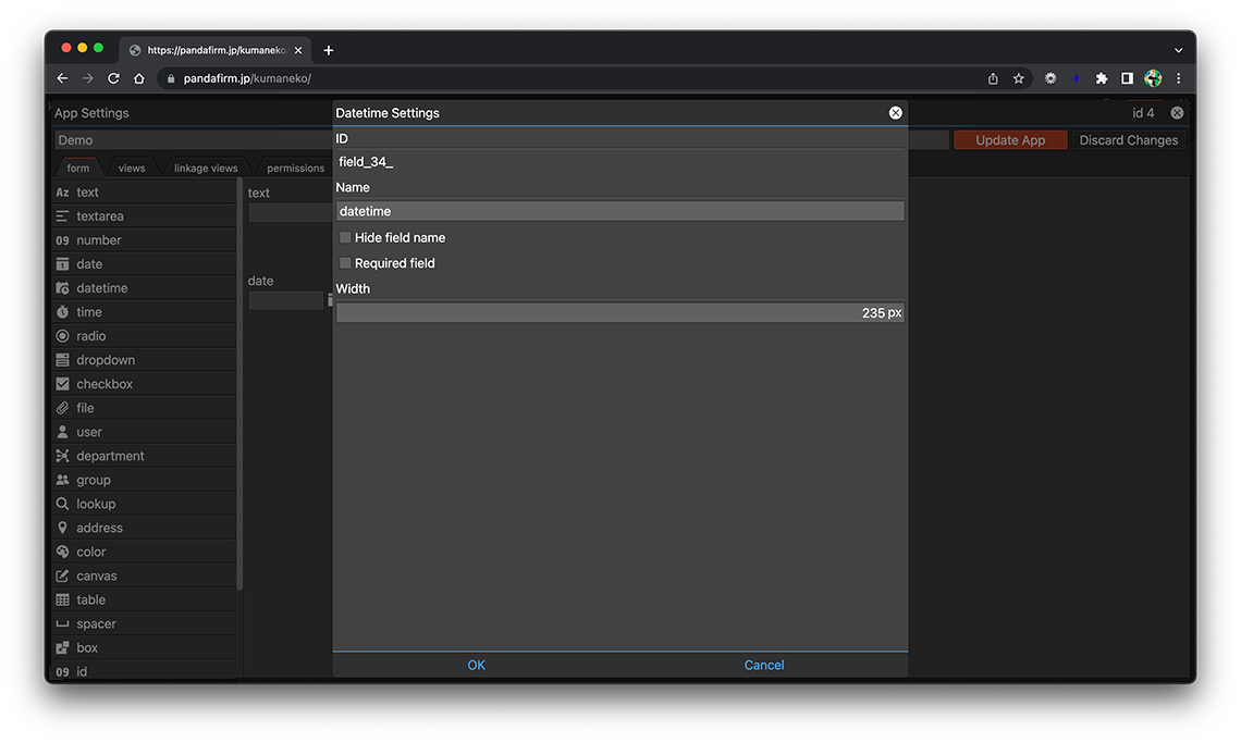 A datetime field is a field for entering a date and time. Click the gear button in the field placed on the form to display the setting screen, and configure the setting according to your purpose on that screen.