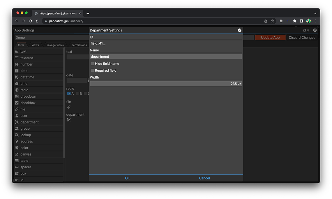 A department field is a field for selecting multiple departments from registered departments. Click the gear button in the field placed on the form to display the setting screen, and configure the setting according to your purpose on that screen.
