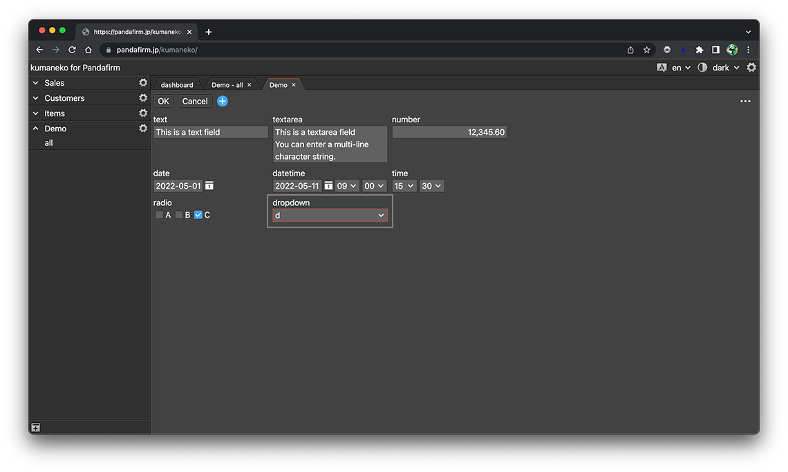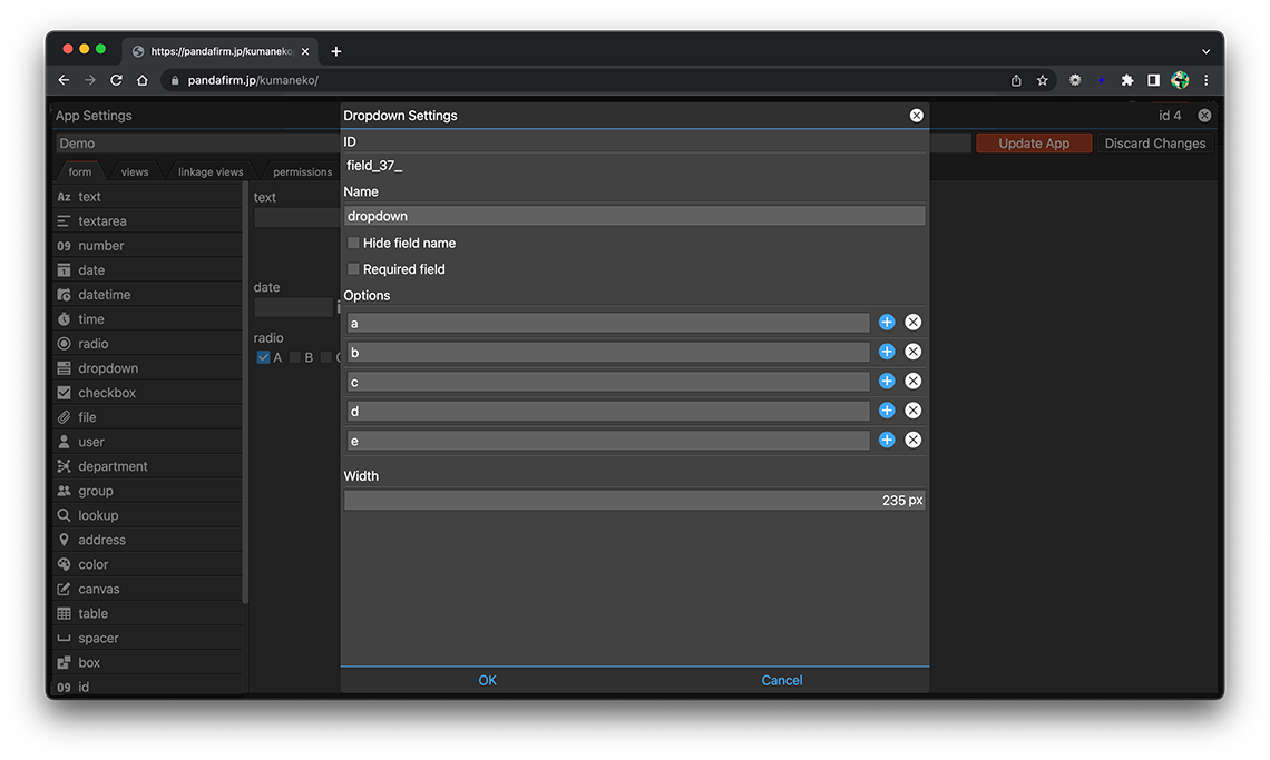 A dropdown field is a field for selecting only one of multiple options. Click the gear button in the field placed on the form to display the setting screen, and configure the setting according to your purpose on that screen.