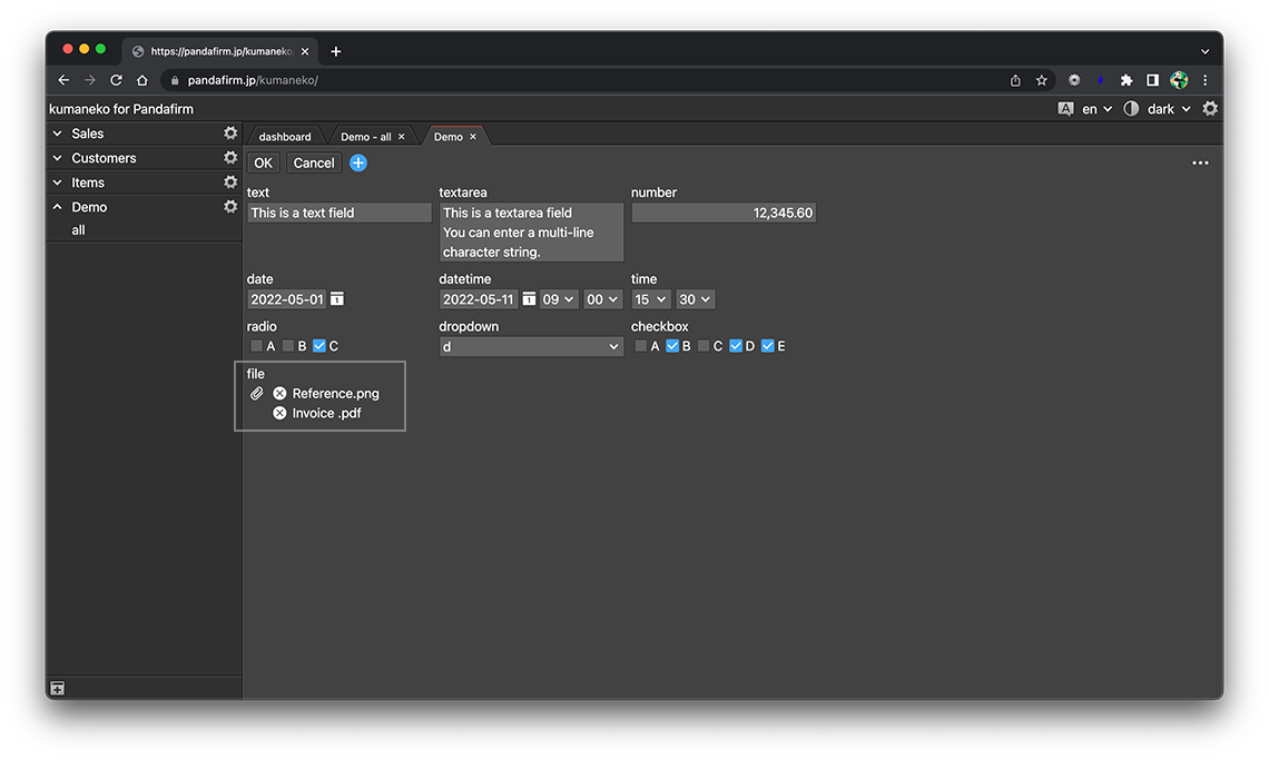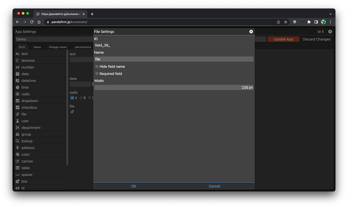 A file field is a field for uploading files. Click the gear button in the field placed on the form to display the setting screen, and configure the setting according to your purpose on that screen.