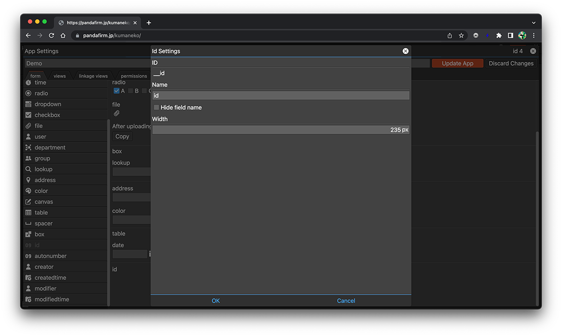 A id field is a field that is automatically numbered from 1 each time adding records. Click the gear button in the field placed on the form to display the setting screen, and configure the setting according to your purpose on that screen.