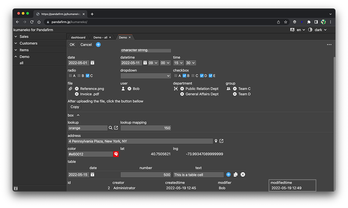 A modifiedtime field is a field that automatically sets the date and time when the record was last saved. Click the gear button in the field placed on the form to display the setting screen, and configure the setting according to your purpose on that screen.