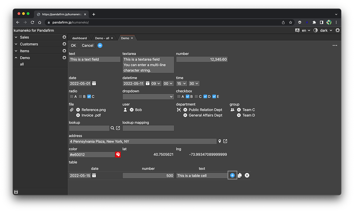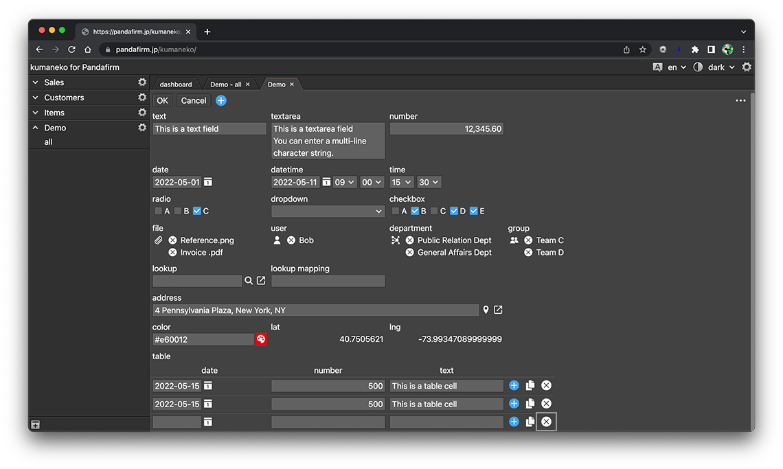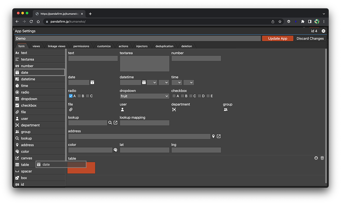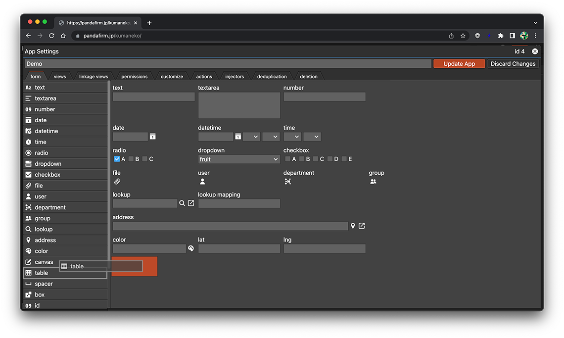 A table field is a field for adding or removing rows that you have placed fields as needed. Click the gear button in the field placed on the form to display the setting screen, and configure the setting according to your purpose on that screen.