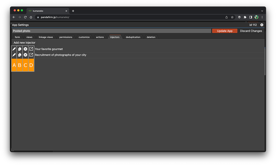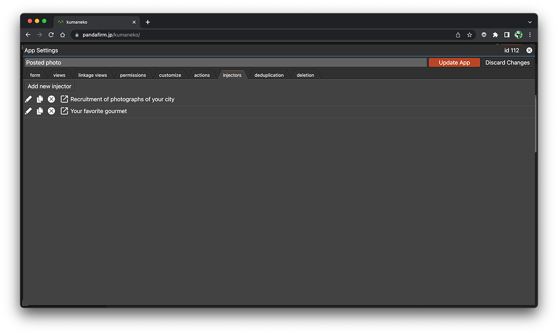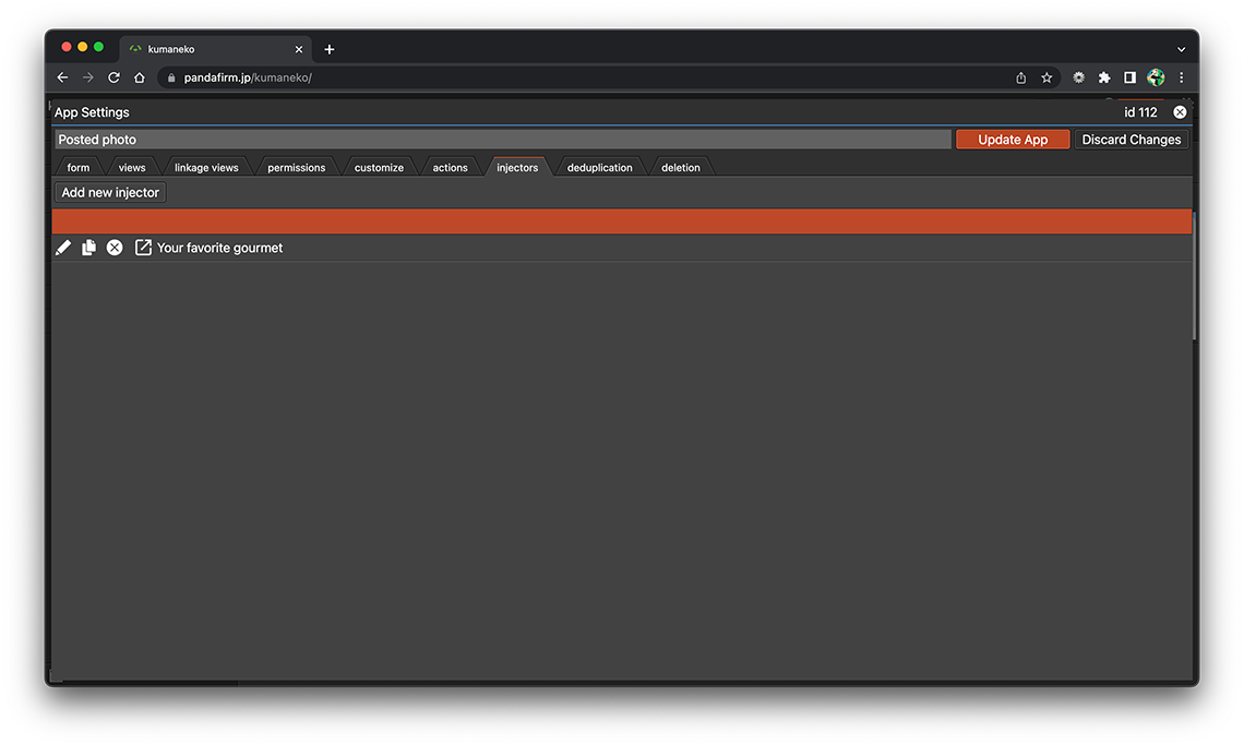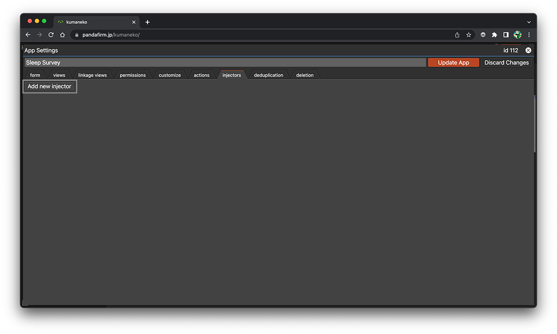 To create a injector, click the "injector" tab on the app settings screen and click the "Add new injector" button.