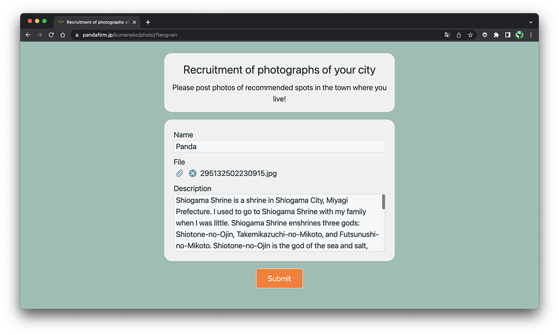 If the URL where you installed kumaneko is http://example.com/kumaneko/ and you enter "photo" as the directory name, the URL of the web page will be http://example.com/kumaneko/photo/.