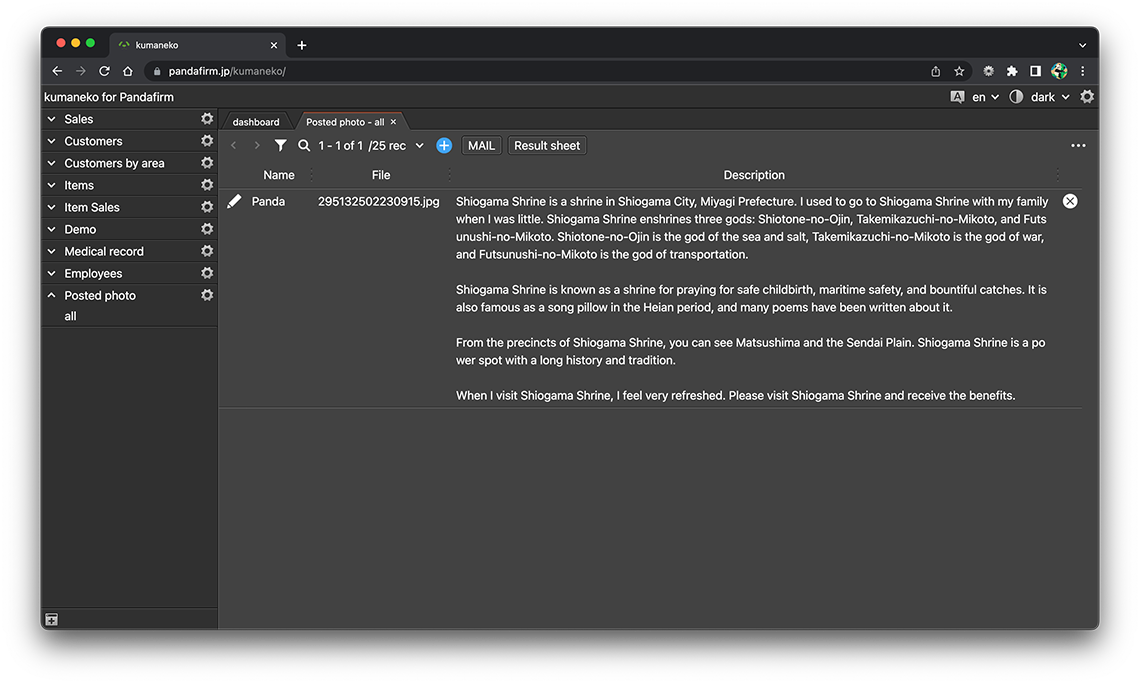 Open the created web page, enter the values in each field, and click the "Submit" button to register the record in kumaneko.