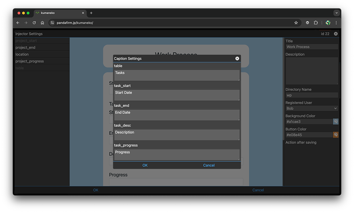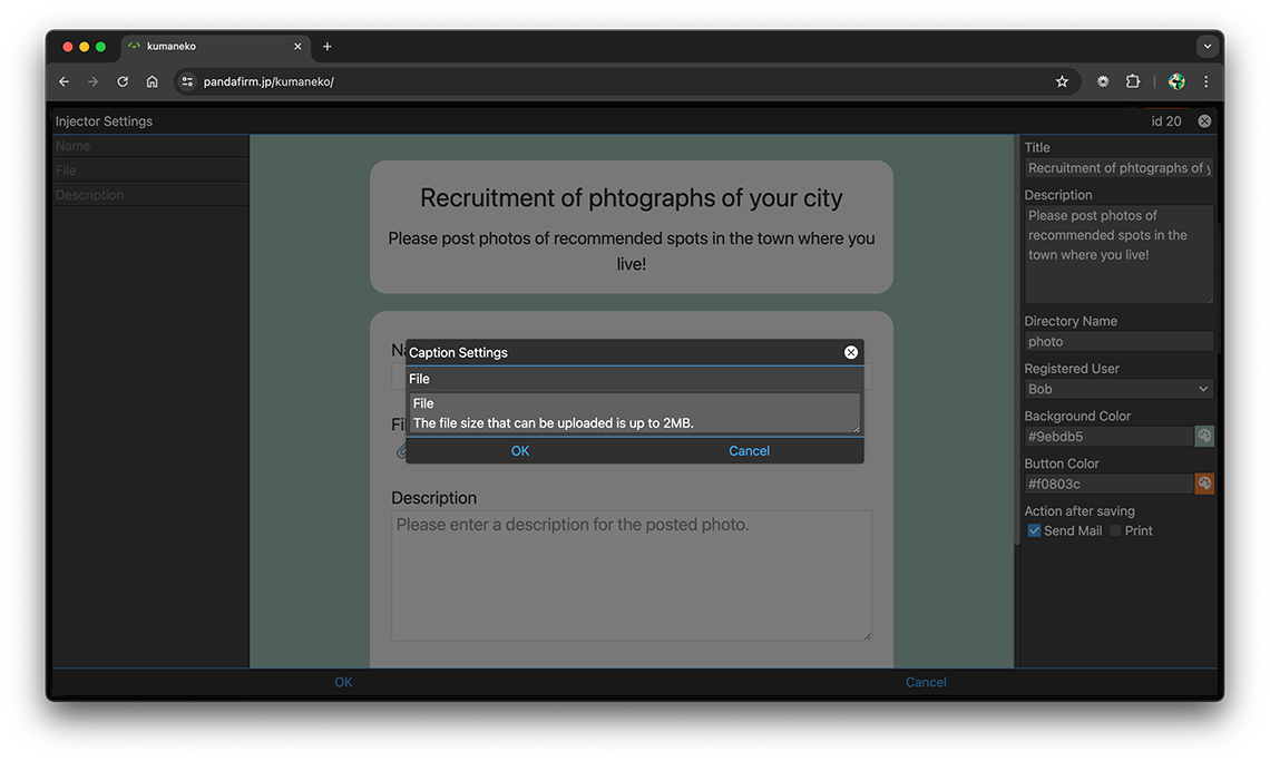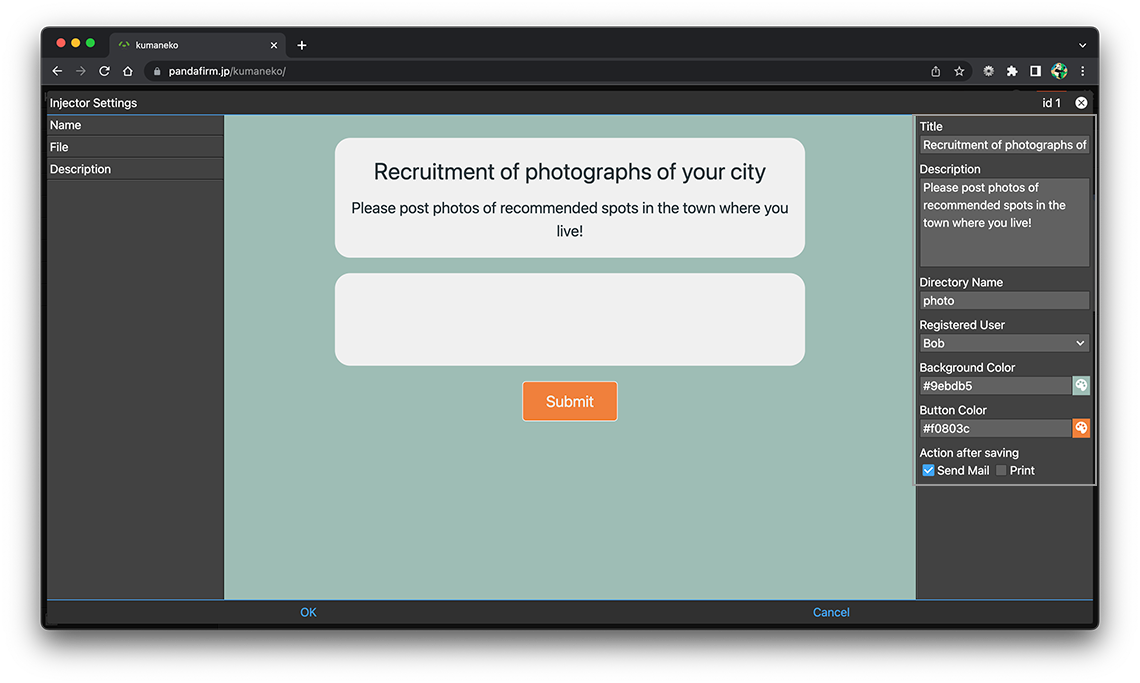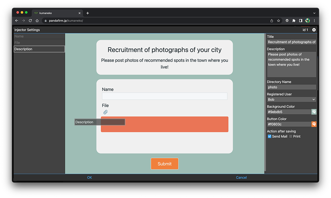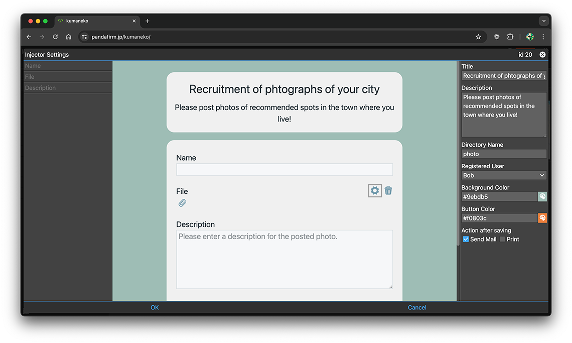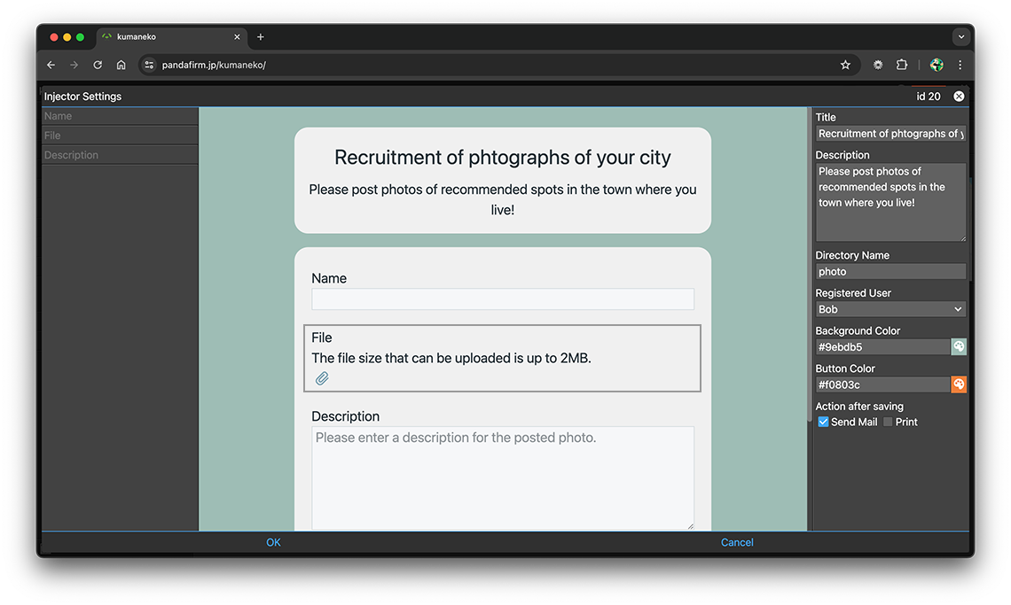 Injector is a feature that allows you to create survey or inquiry forms using fields placed on a form, and automatically saves the content, thus creating a web page.