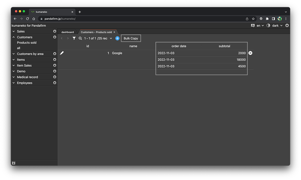 When you press the displayed copy button, copy processing will be executed for all records that meet the display conditions of the view.