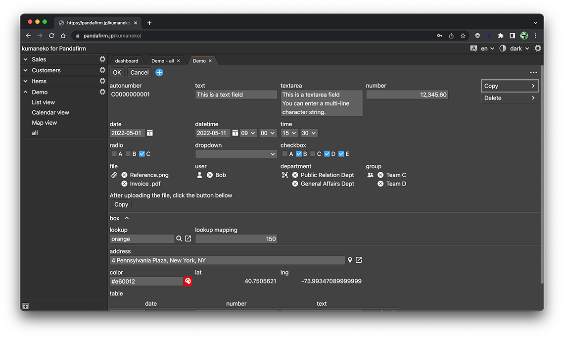 Open the edit screen of the record you want to copy, and click the Copy button from the menu button on the upper right.