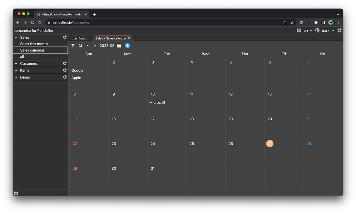 A calendar view displays the data in date cells. Creation is done from the "views" tab on the app settings screen.
