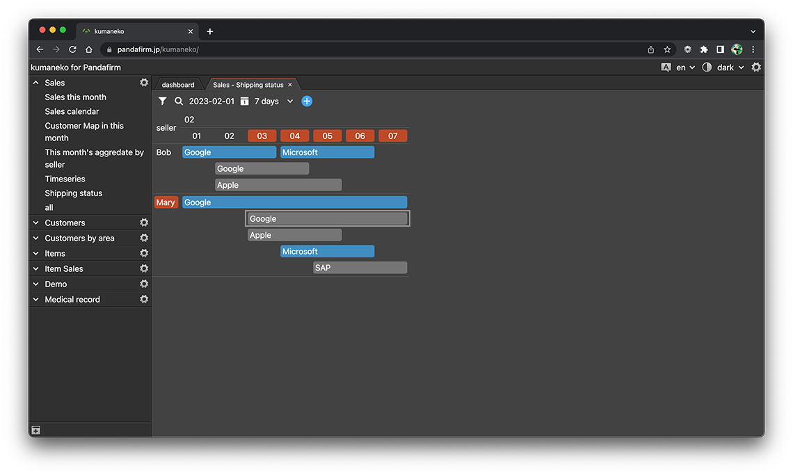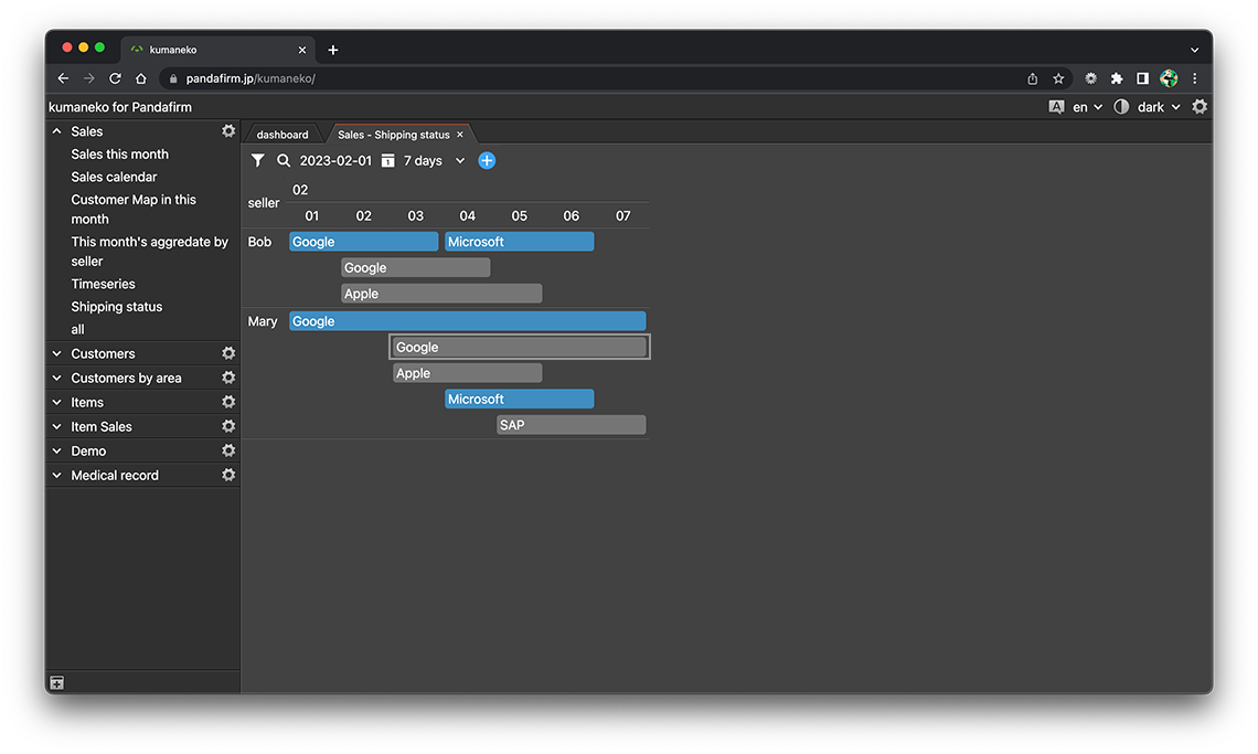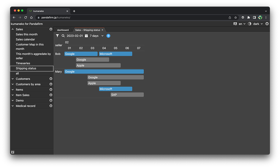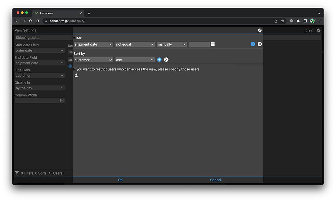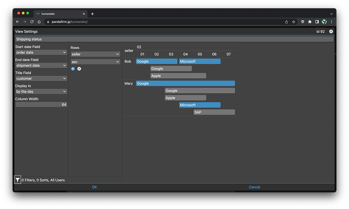 A gantt view categorizes records by the values of multiple fields and displays them on the screen as a taskbar. Creation is done from the "views" tab on the app settings screen.