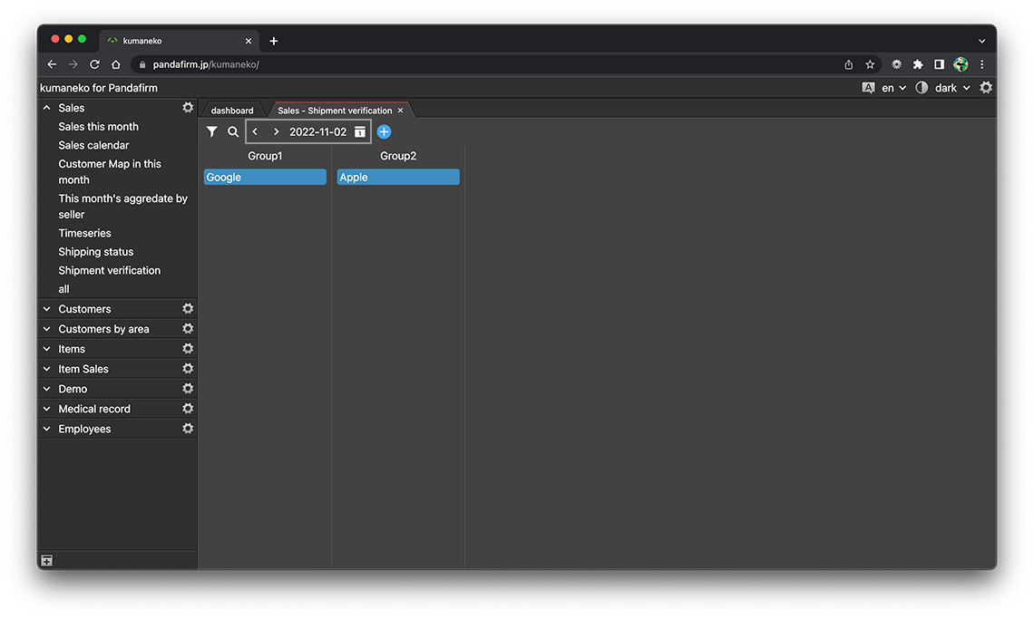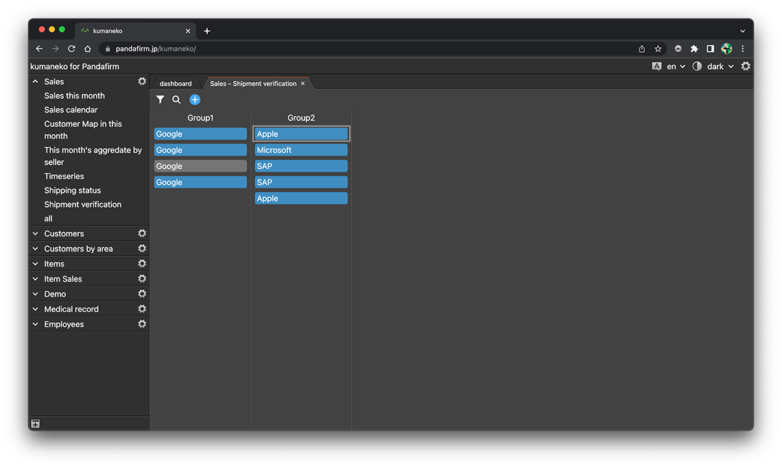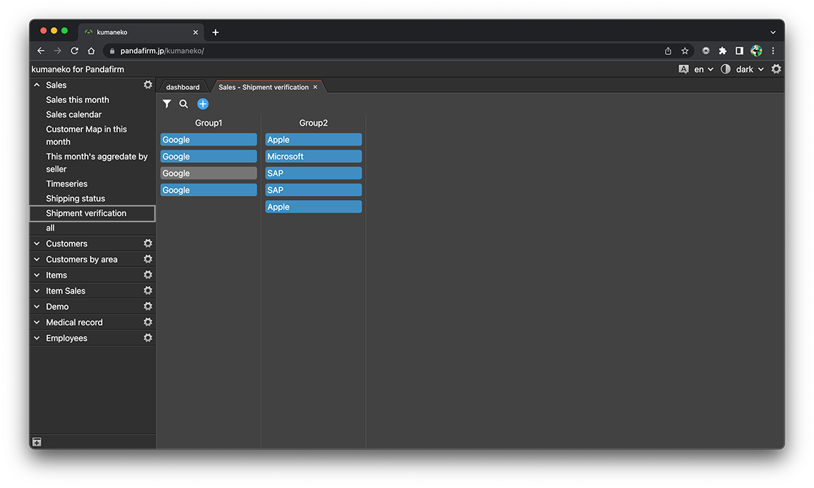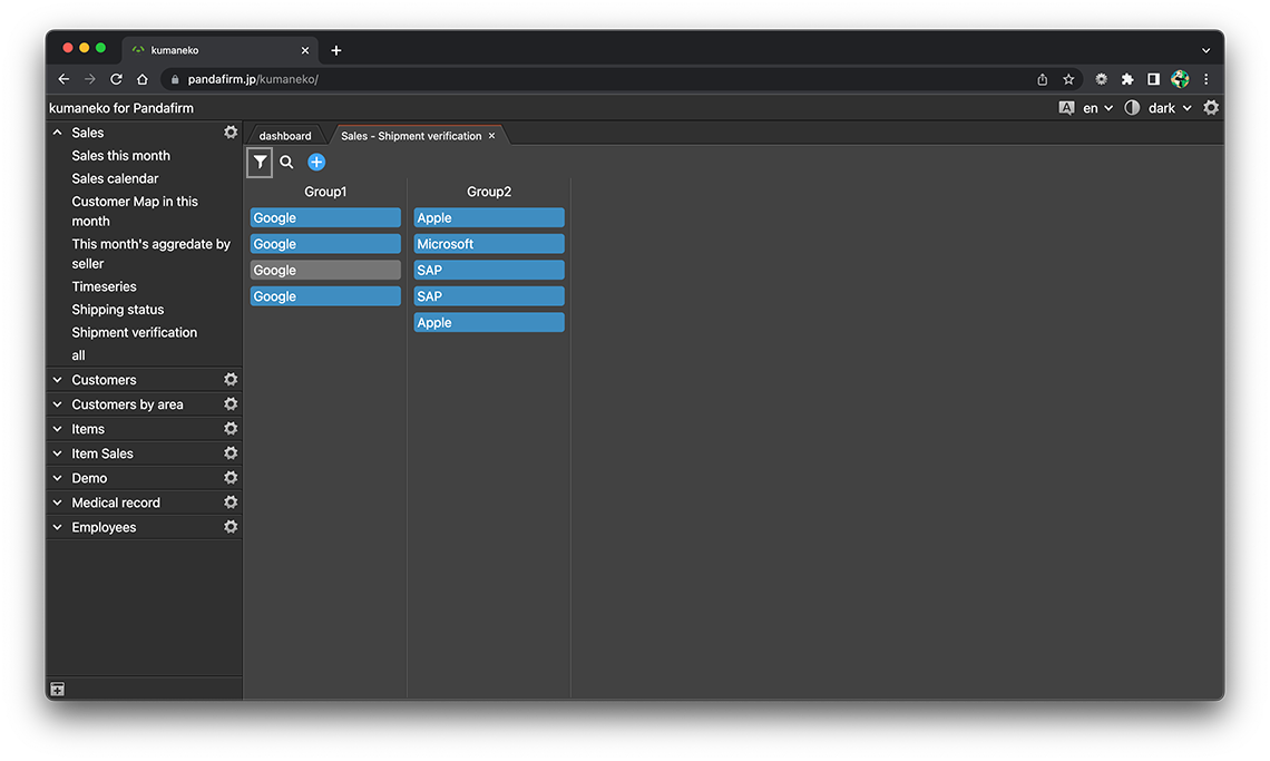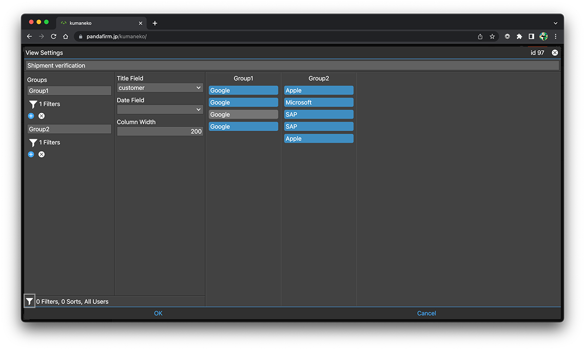 A kanban view categorizes records by the values of multiple fields and displays them on the screen as a task card. Creation is done from the "views" tab on the app settings screen.