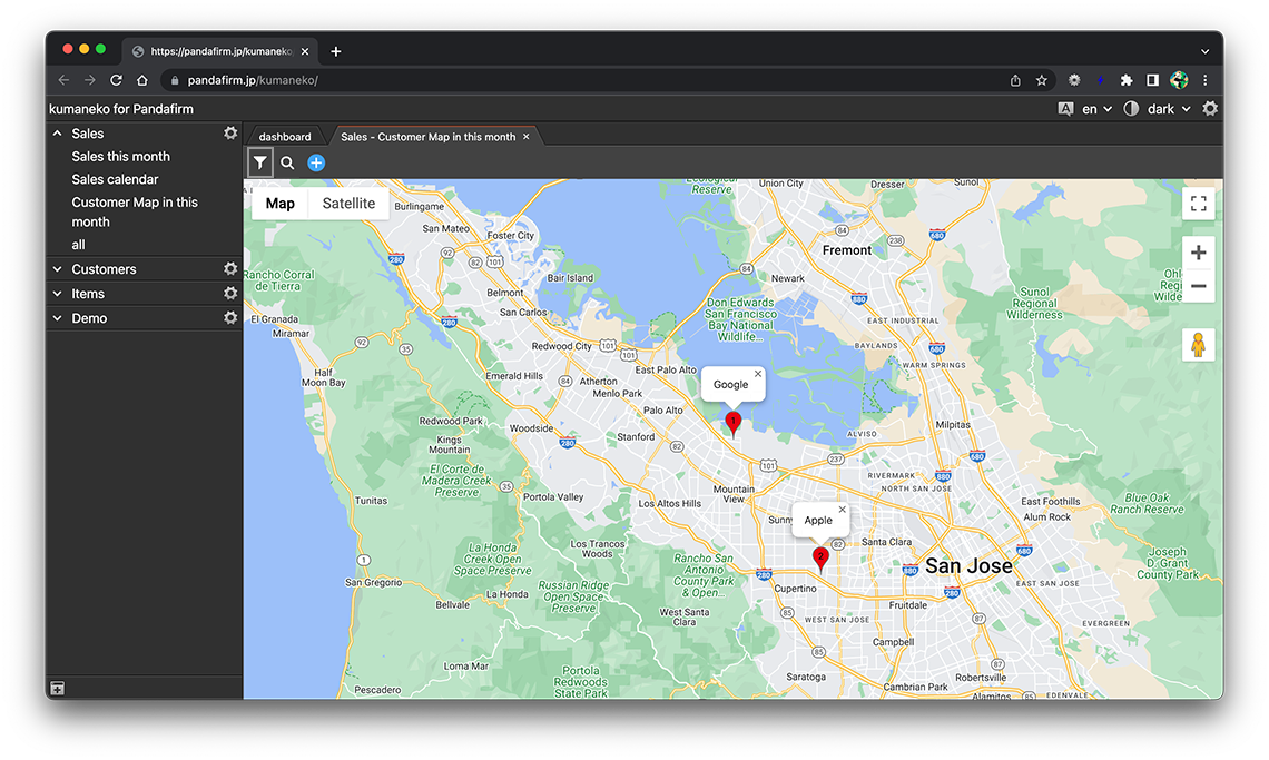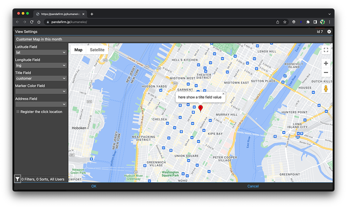 If you want to get the address in addition to the latitude and longitude when you click the location you want to add on the map and add the record, specify it.