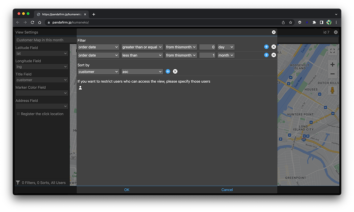 A map view displays data whose latitude and longitude are within the map's display area. Creation is done from the "views" tab on the app settings screen.