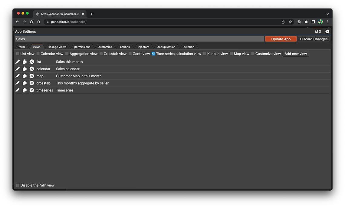 A timeseries view combines multiple datasets aggregated by field and displays the calculated results by day or by month. Creation is done from the "views" tab on the app settings screen.