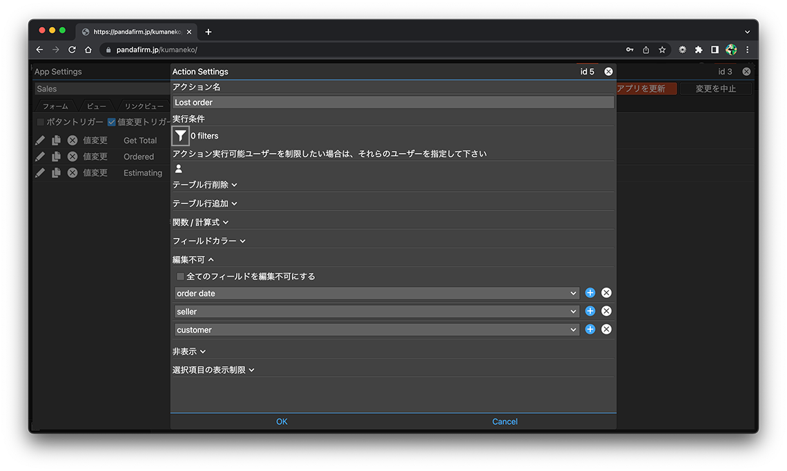 アクション名を入力し、「編集不可」欄から編集不可とするフィールドの選択を行います。