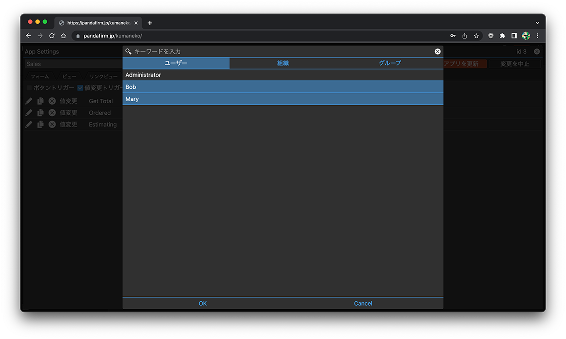 アクションはユーザー毎に、その実行可否を判断させることが出来ます。アクションの実行が可能なユーザーを設定するには、ユーザーボタンを押下します。