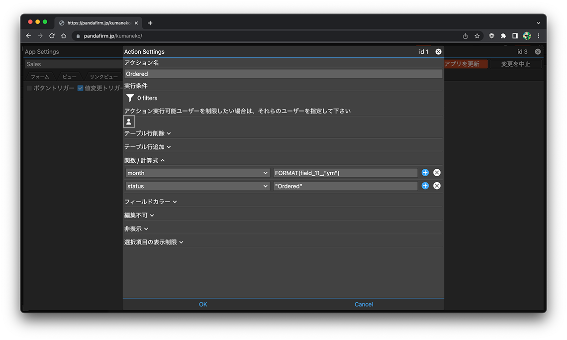 アクション名を入力し、「関数 / 計算式」欄から実行結果をセットするフィールドの選択とセットする値(固定文字列、関数、計算式)の入力を行います。