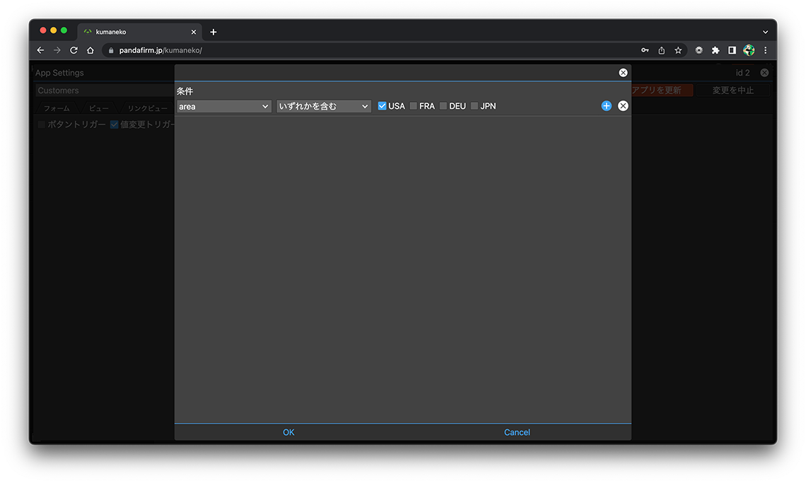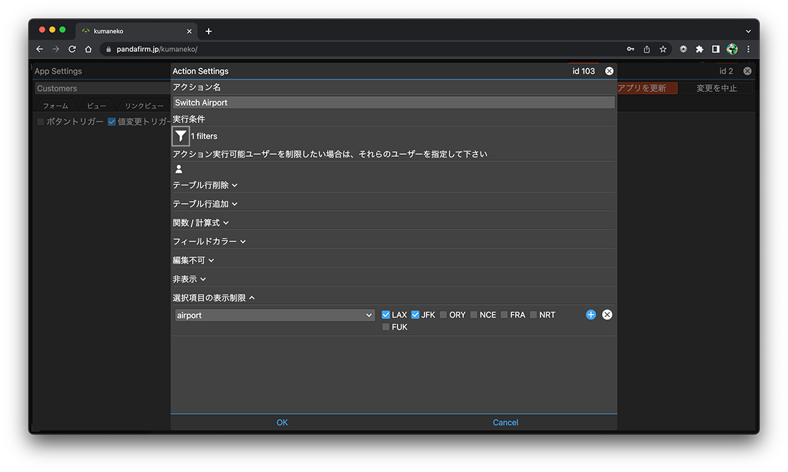 設定が完了したら、「OK」ボタンを押下し、アプリ設定画面の「アプリを更新」ボタンを押下します。