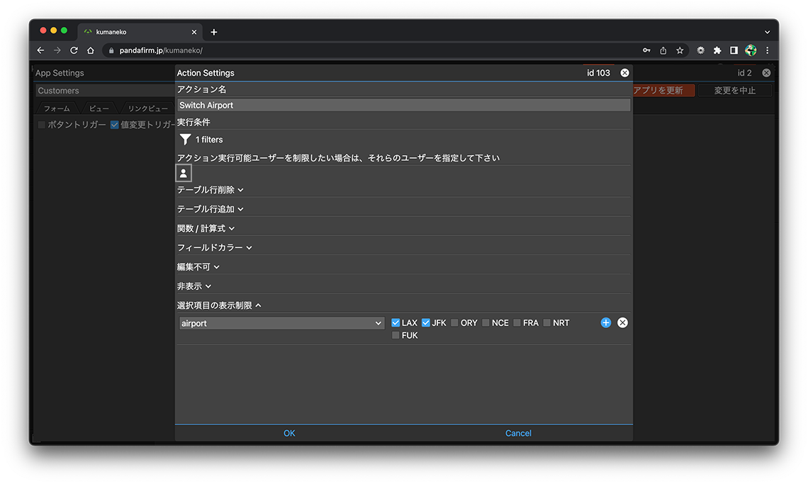 アクション名を入力し、「選択項目の表示制限」欄から対象フィールドと表示させたい項目の選択を行います。