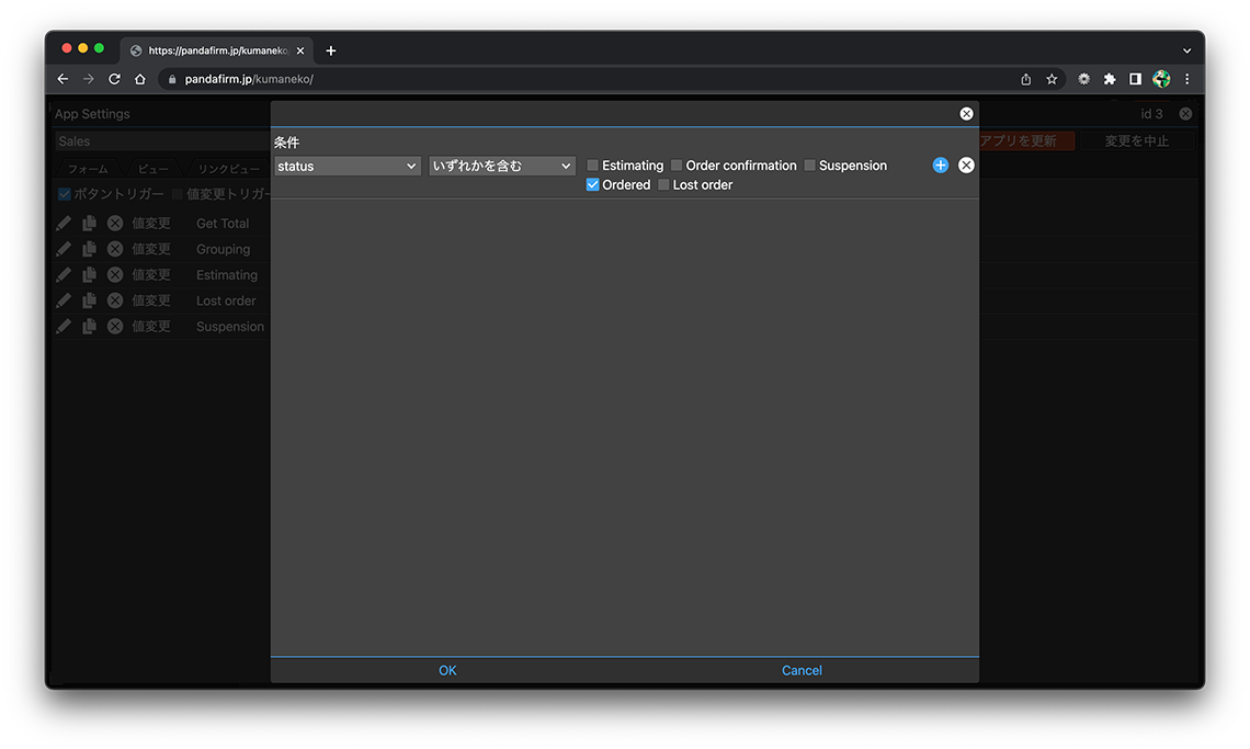 設定が完了したら、「OK」ボタンを押下し、アプリ設定画面の「アプリを更新」ボタンを押下します。