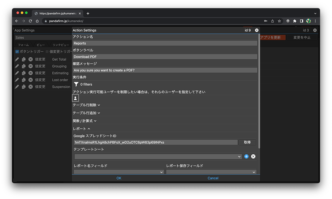 アクション名とボタンラベルとアクション実行前の確認メッセージを入力し、「レポート」欄から作成したSpreadsheetのIDを入力し、取得ボタンを押下ます。