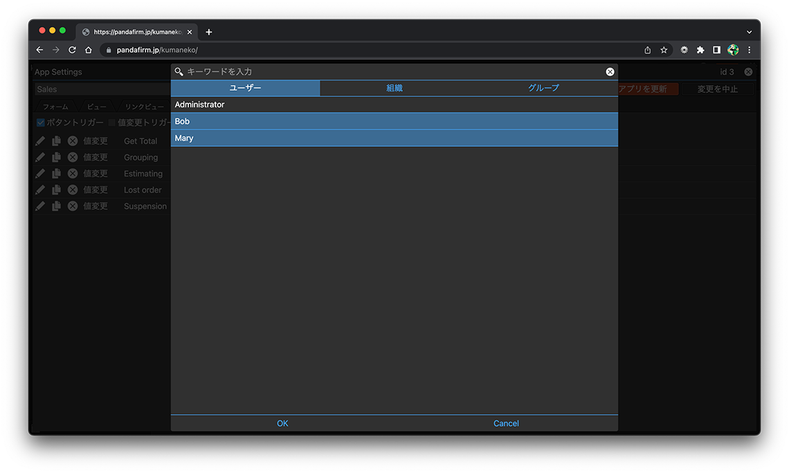 アクションはユーザー毎に、その実行可否を判断させることが出来ます。アクションの実行が可能なユーザーを設定するには、ユーザーボタンを押下します。