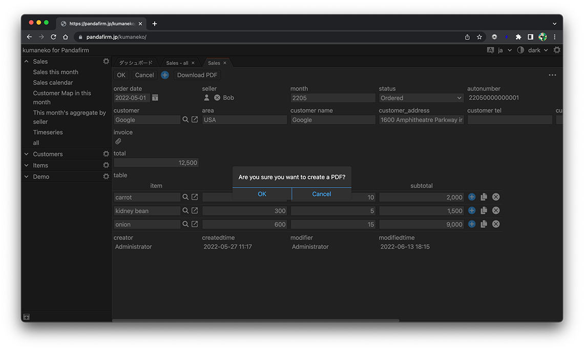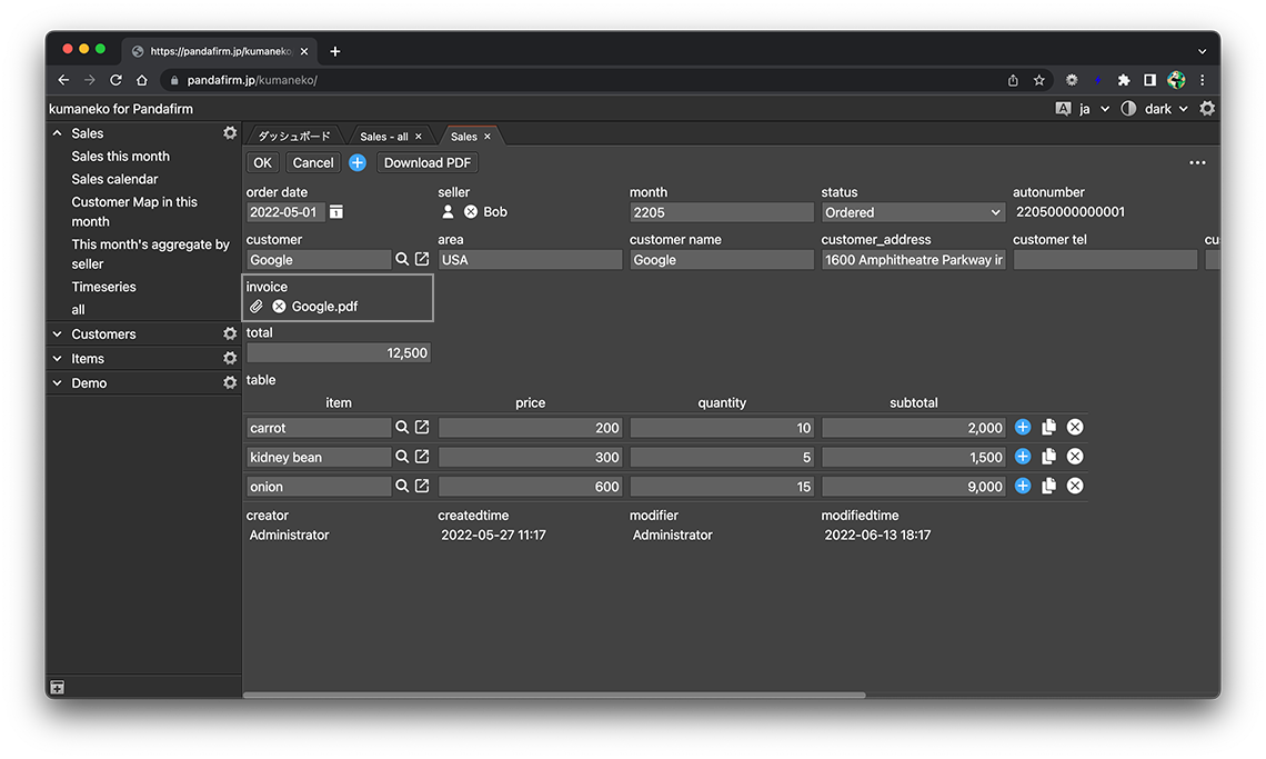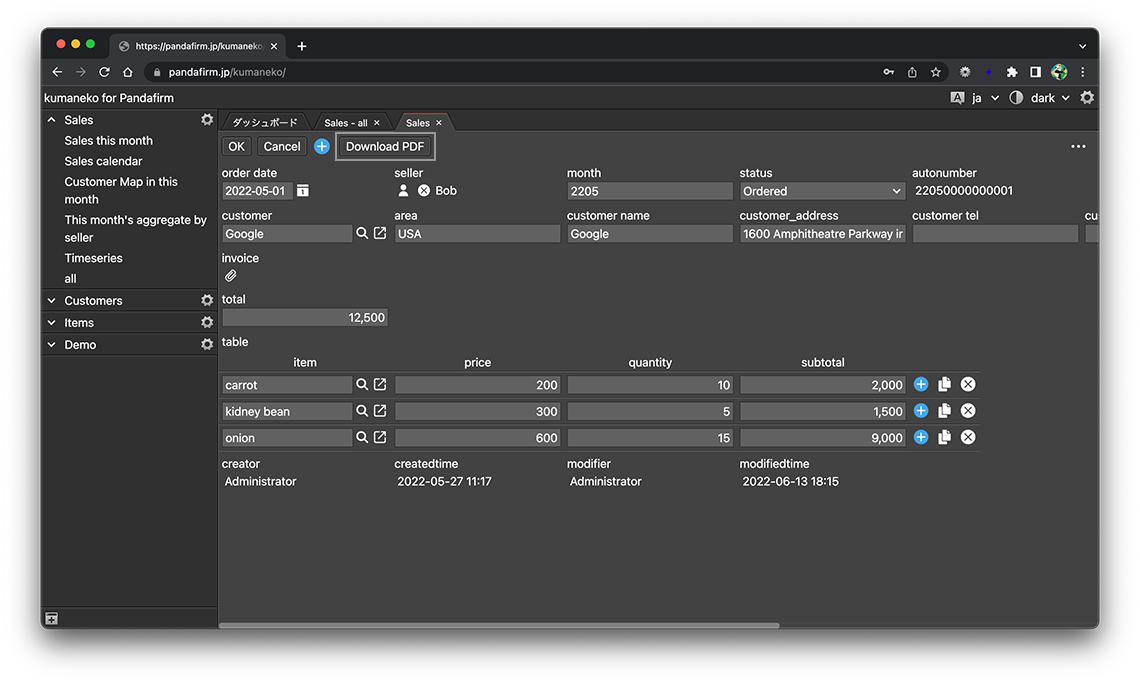 GoogleSpreadsheetをテンプレートにして、レコードデータからPDFを作成することが出来ます。作成はアプリ設定画面の「アクション」タブから行います。