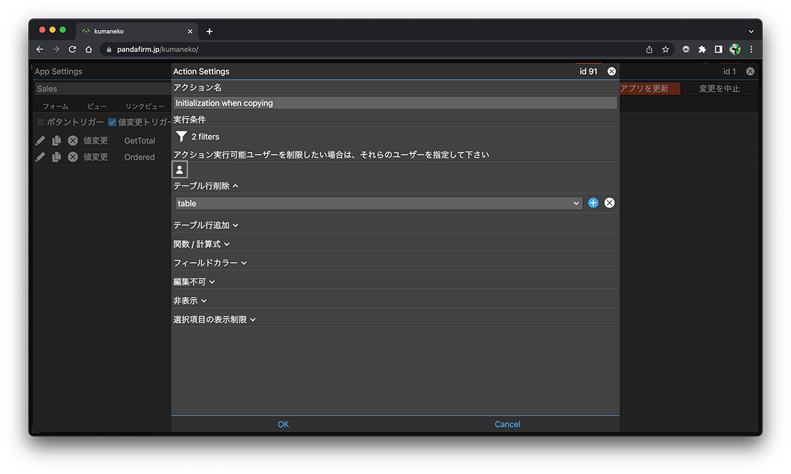 レコード追加画面や編集画面を開いたり、フィールドを編集したりしたタイミングで、テーブルの行を削除することが出来ます。作成はアプリ設定画面の「アクション」タブから行います。