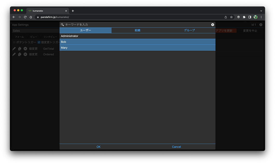 アクションはユーザー毎に、その実行可否を判断させることが出来ます。アクションの実行が可能なユーザーを設定するには、ユーザーボタンを押下します。