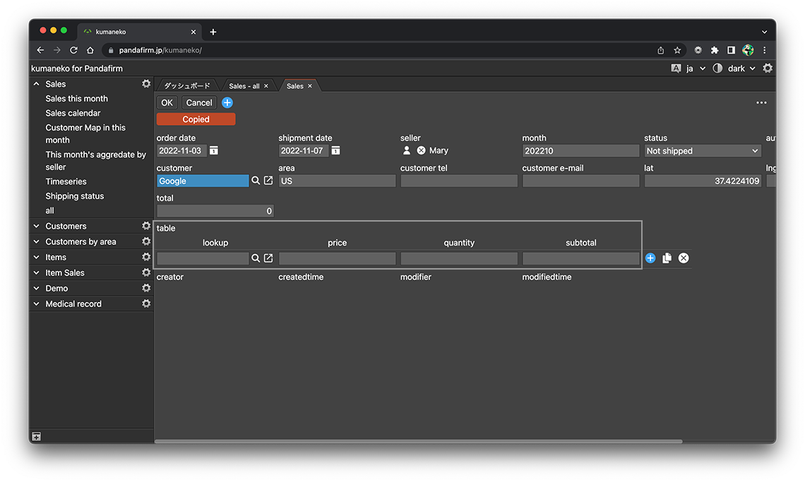 ボタントリガーアクションの場合は、レコード追加画面や編集画面、読み取り専用一覧形式ビューに配置されたボタンを押下することで、アクションが実行されます。