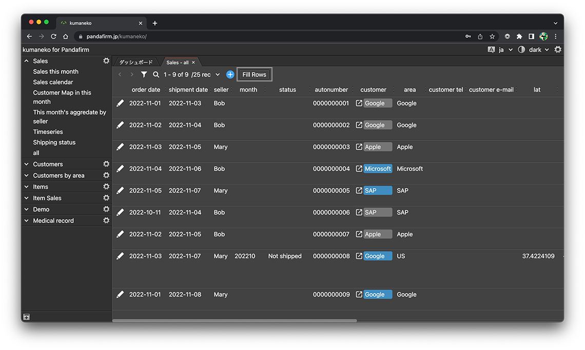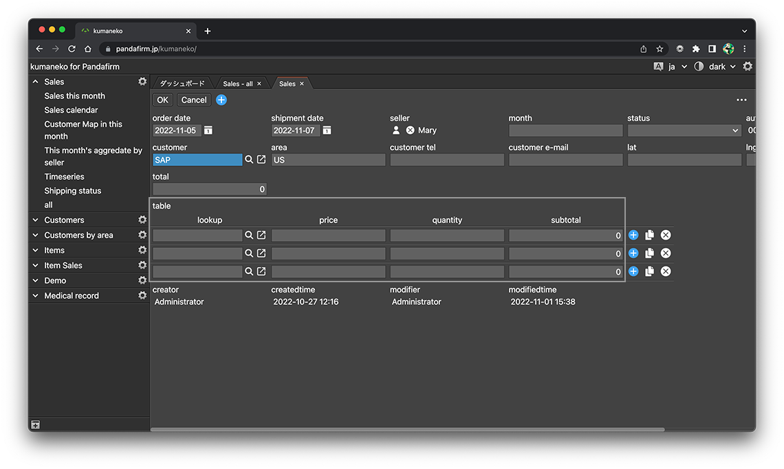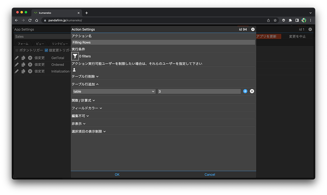 レコード追加画面や編集画面を開いたり、フィールドを編集したりしたタイミングで、テーブルに行を追加することが出来ます。作成はアプリ設定画面の「アクション」タブから行います。