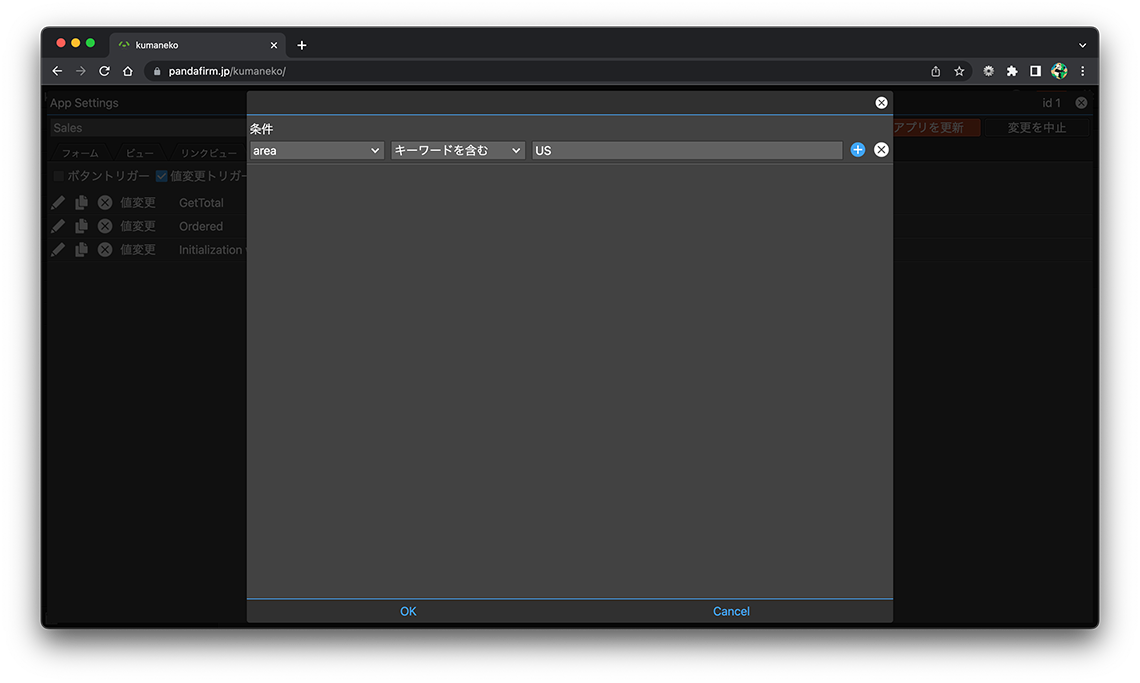 設定が完了したら、「OK」ボタンを押下し、アプリ設定画面の「アプリを更新」ボタンを押下します。