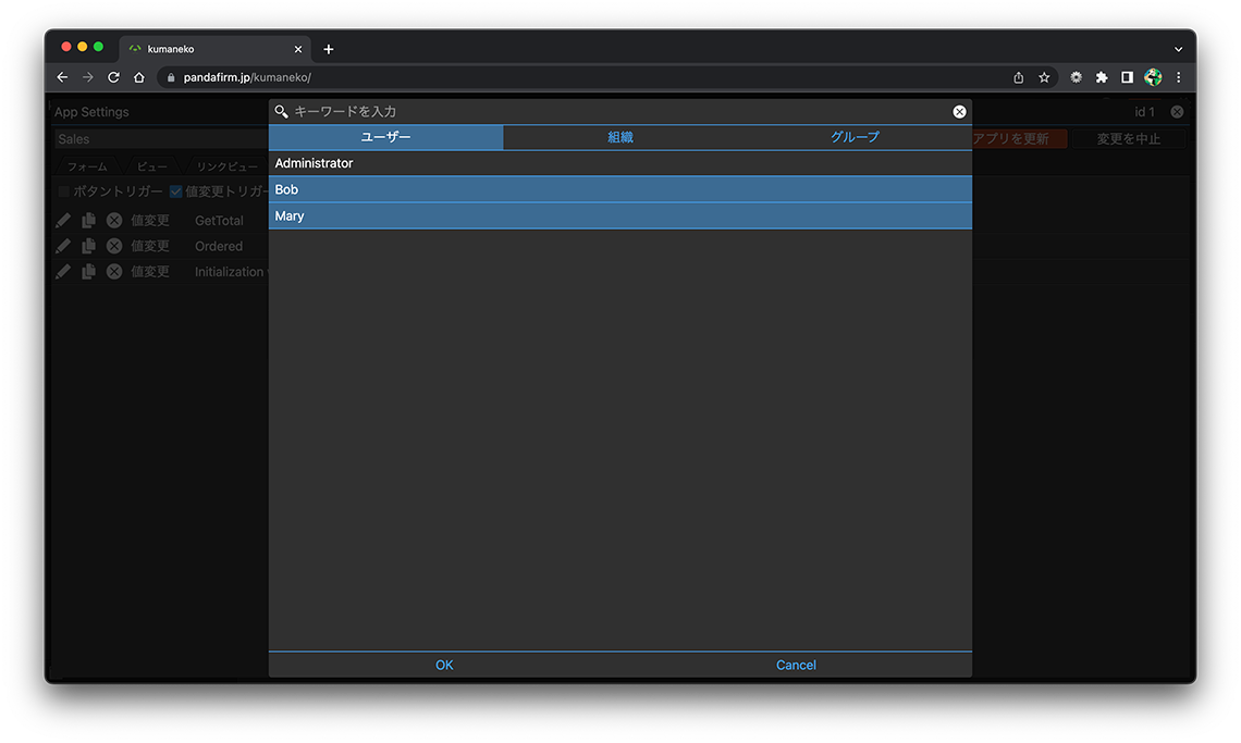 アクションはユーザー毎に、その実行可否を判断させることが出来ます。アクションの実行が可能なユーザーを設定するには、ユーザーボタンを押下します。
