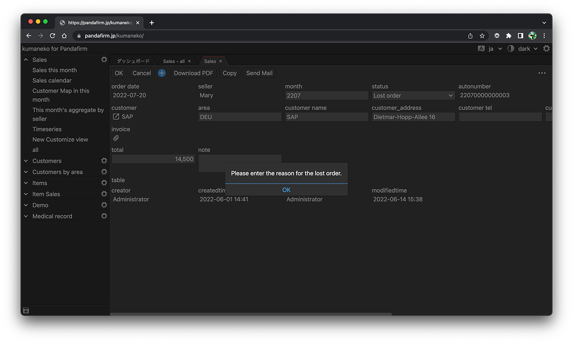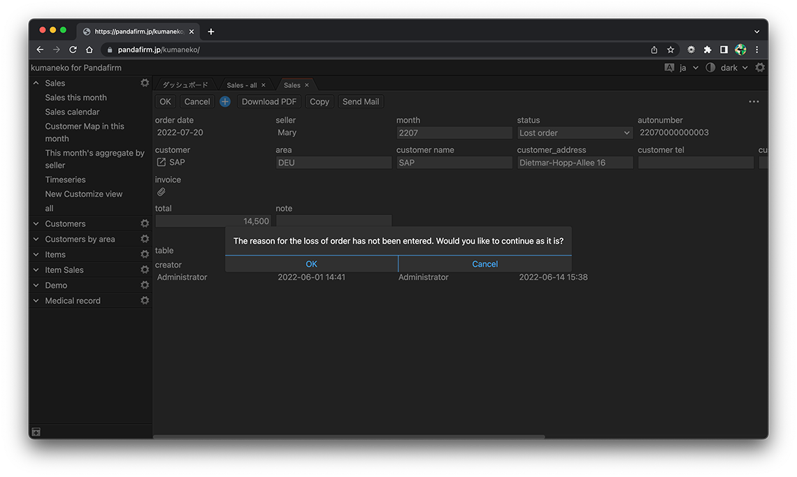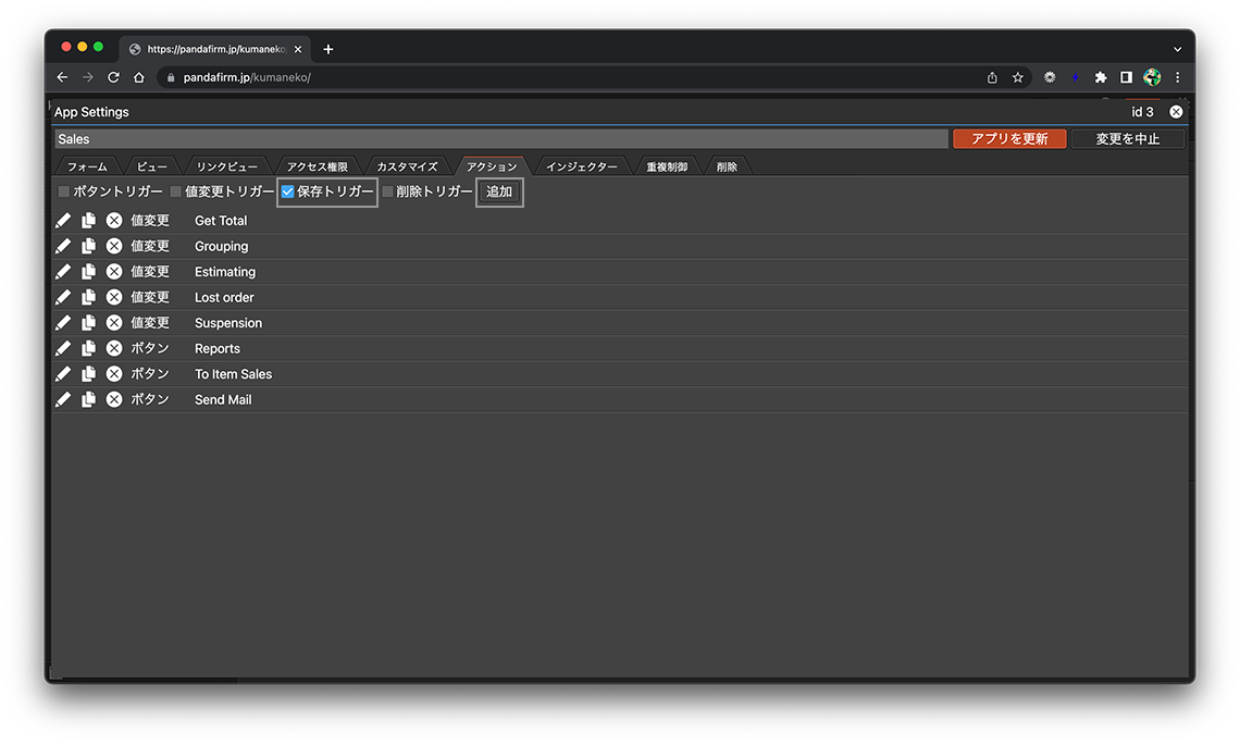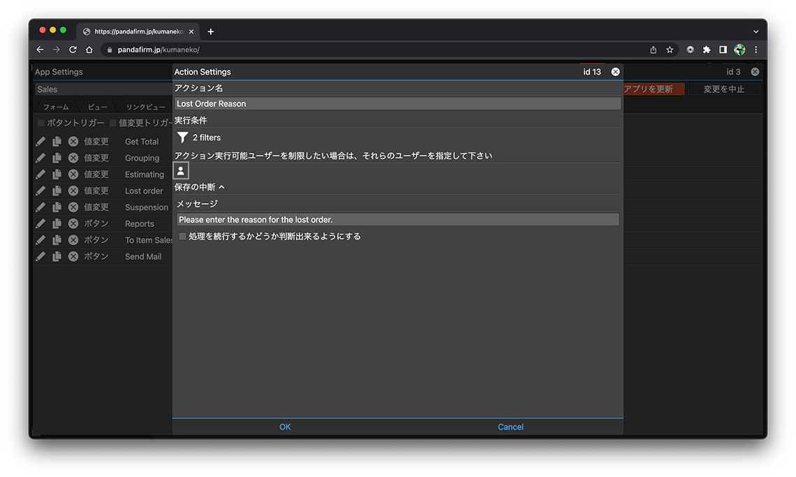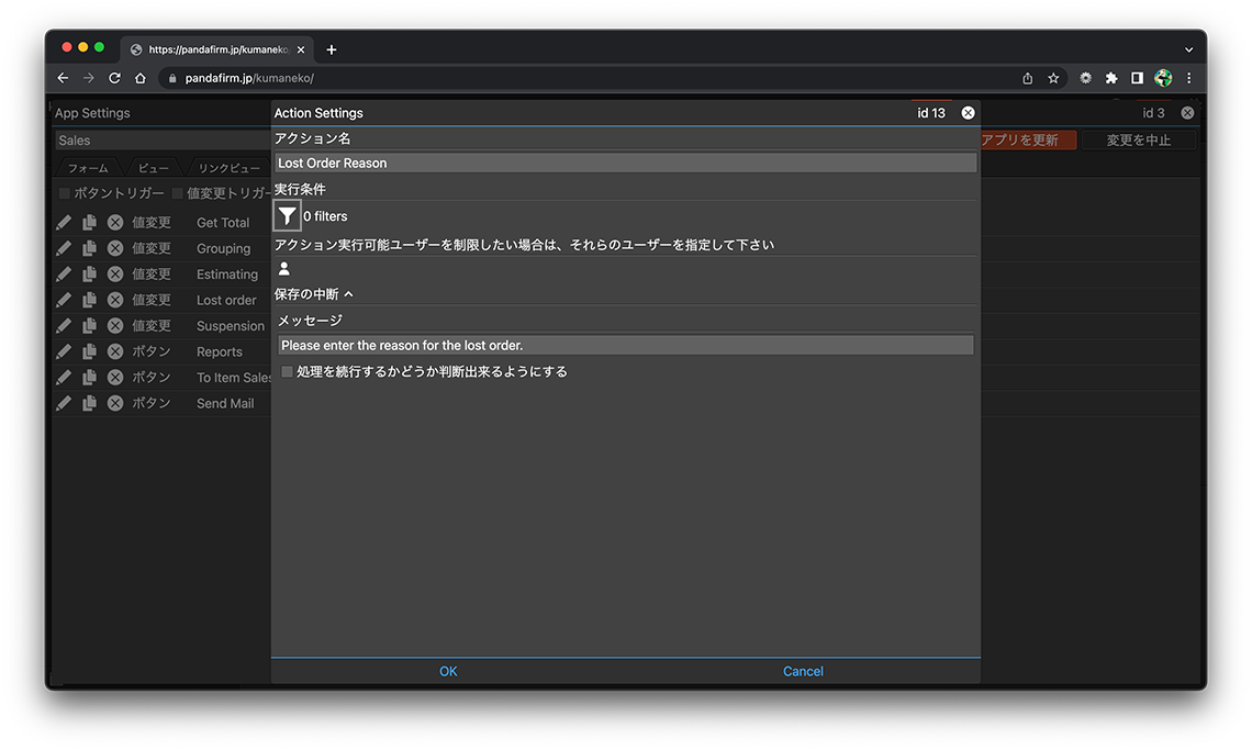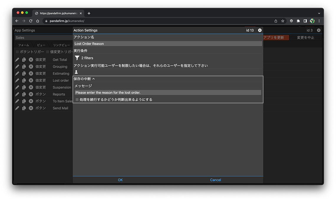 レコードを保存するタイミングで、レコードの状態に応じて処理を中止したり、このまま続行するかどうかを確認するダイアログを表示することが出来ます。作成はアプリ設定画面の「アクション」タブから行います。