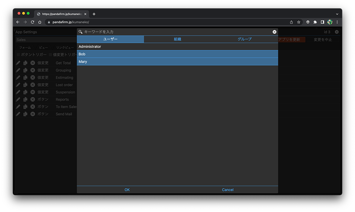 アクションはユーザー毎に、その実行可否を判断させることが出来ます。アクションの実行が可能なユーザーを設定するには、ユーザーボタンを押下します。