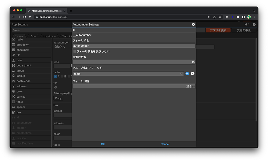 autonumberフィールドは、レコードの保存時に、指定した条件に合わせて採番を行うフィールドです。フォームに配置したフィールド上の歯車ボタンを押下すると表示される画面から、利用目的に合った設定をして下さい。